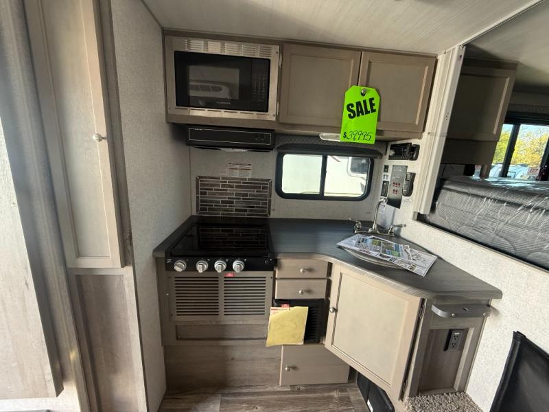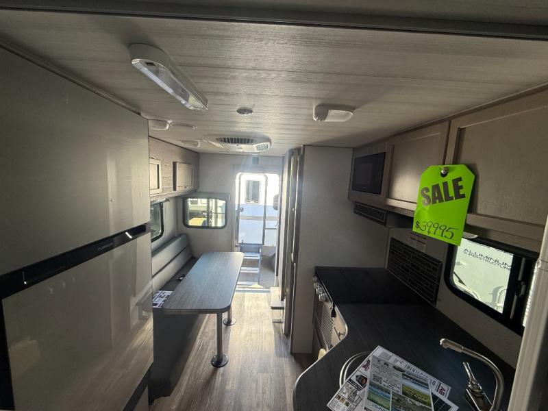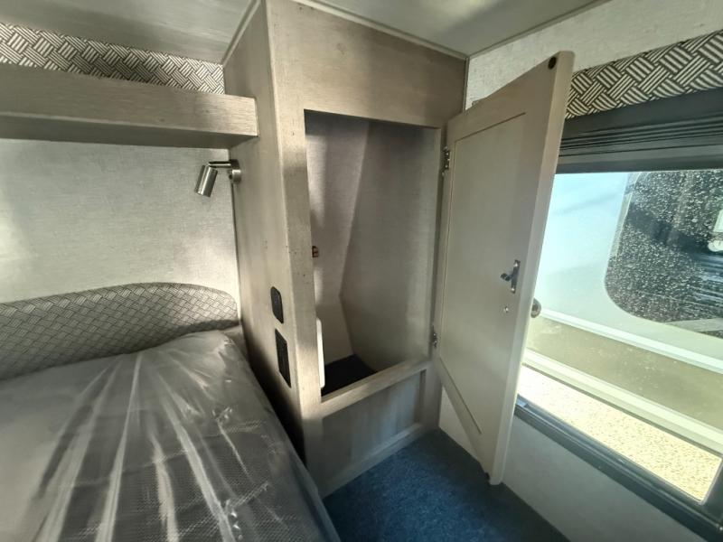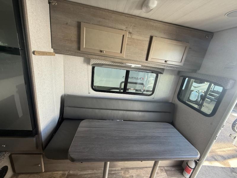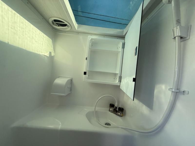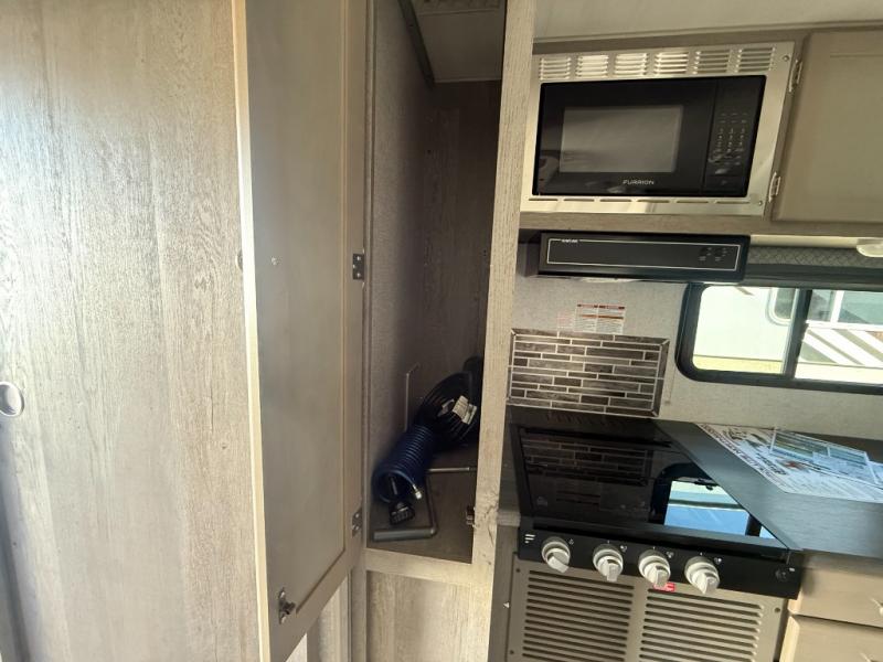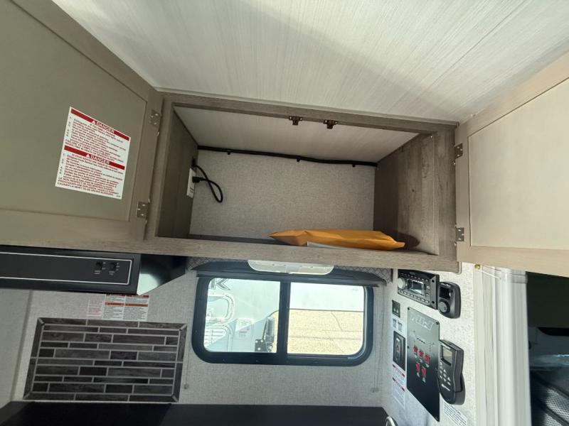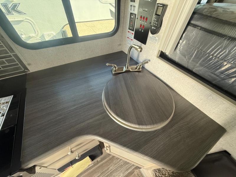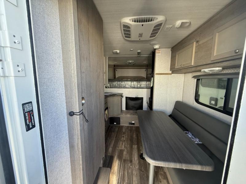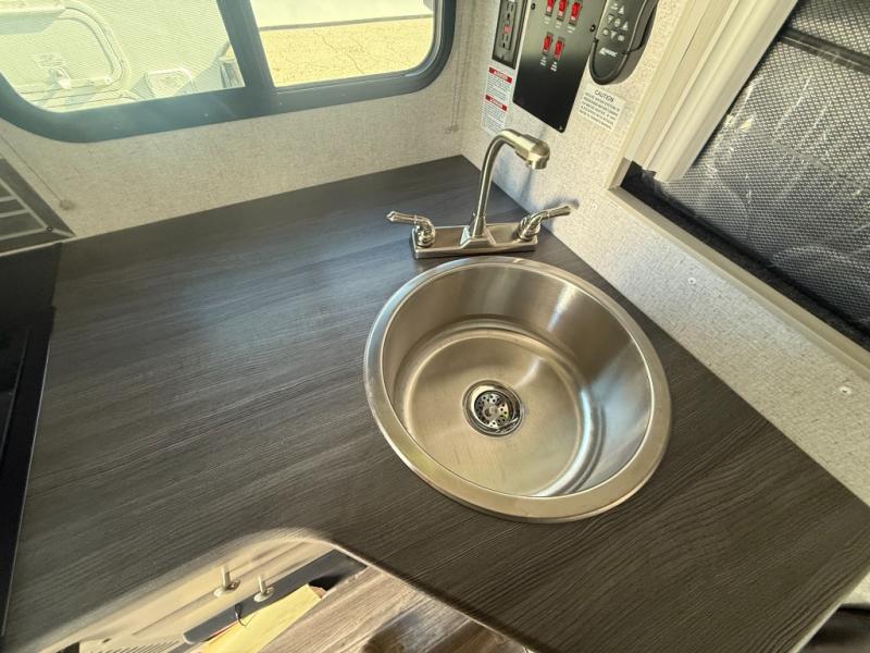 Head across the states in this comfortable truck camper for four. Once you find a campground to park for the night, start lunch on the three burner cooktop, or use the residential microwave with an air fryer for a quick meal. The U-shaped dinette will be the perfect place to dine at, or you can choose the optional roll-over sofa here. The dinette converts to a 38" x 77" sleeping area, plus there is an overhead bunk. You will enjoy the front 58" x 80" queen bed that includes three wardrobes and a nightstand for your things, and don't forget to add the optional 24" 12V LED TV for movies in bed.