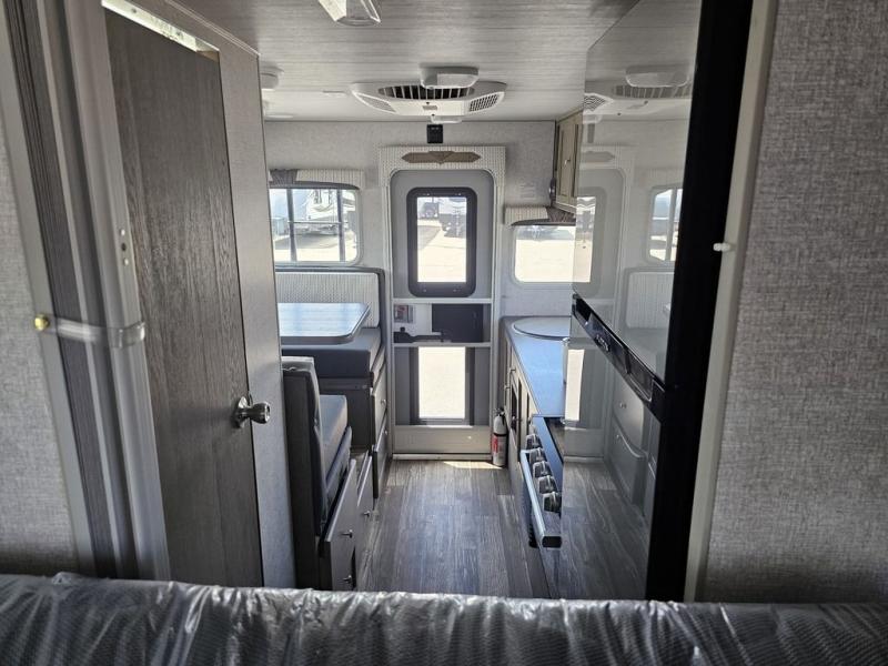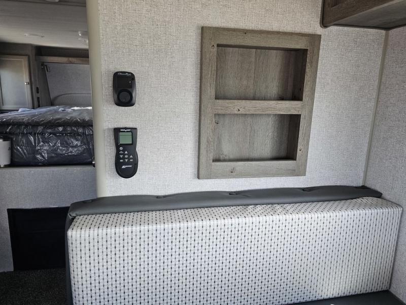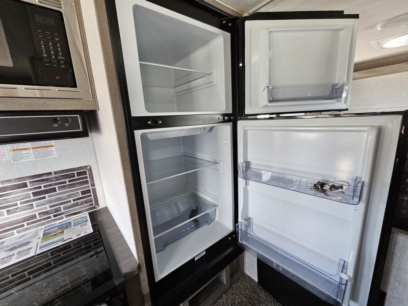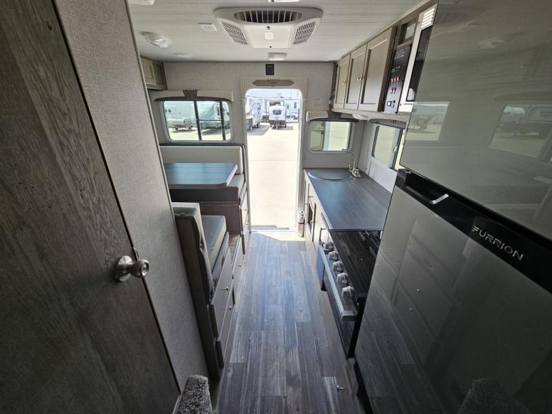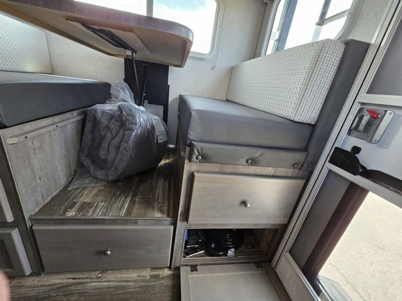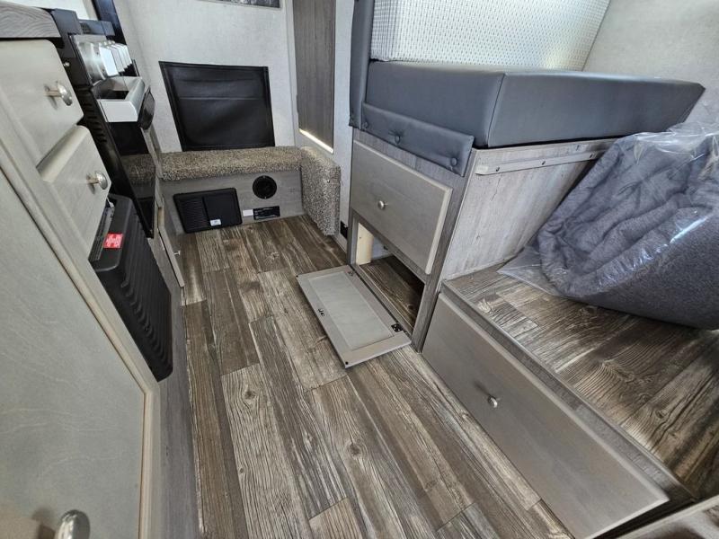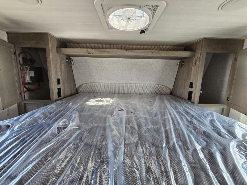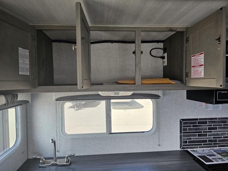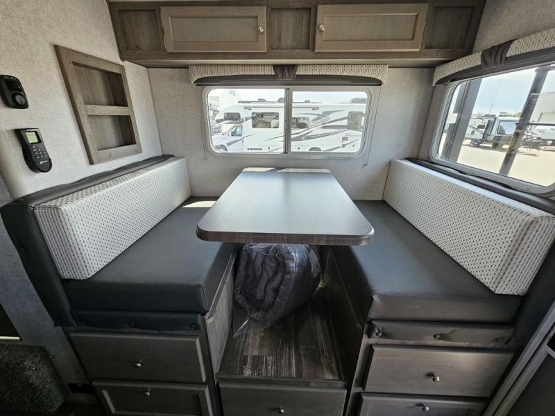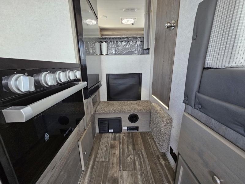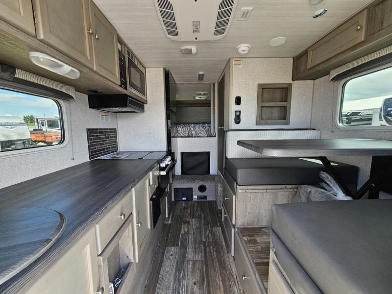 Make your weekend excursions easier than ever in this cozy truck camper for three to four. Since there is a 58" x 80" queen bed up front, you won't have to sleep on the floor, and your guests can sleep on the booth dinette that converts to a 40" x 72" sleeping area. Get cleaned up each day in the convenient wet bath that includes a medicine cabinet and an exhaust fan to keep everything fresh. There is a three burner cooktop and residential-style microwave with an air fryer to prepare meals each day, plus an 8 cu. ft. 12V refrigerator for perishables. This model also includes three wardrobes around the bed for more storage place plus a TV location if you want to add the optional 24" 12V LED TV!