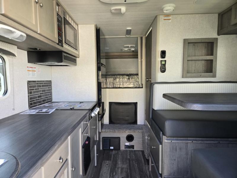 Make your weekend excursions easier than ever in this cozy truck camper for three to four. Since there is a 58" x 80" queen bed up front, you won't have to sleep on the floor, and your guests can sleep on the booth dinette that converts to a 40" x 72" sleeping area. Get cleaned up each day in the convenient wet bath that includes a medicine cabinet and an exhaust fan to keep everything fresh. There is a three burner cooktop and residential-style microwave with an air fryer to prepare meals each day, plus an 8 cu. ft. 12V refrigerator for perishables. This model also includes three wardrobes around the bed for more storage place plus a TV location if you want to add the optional 24" 12V LED TV!