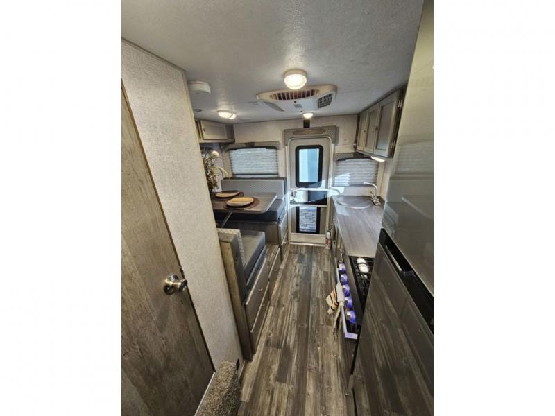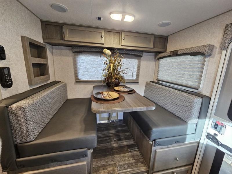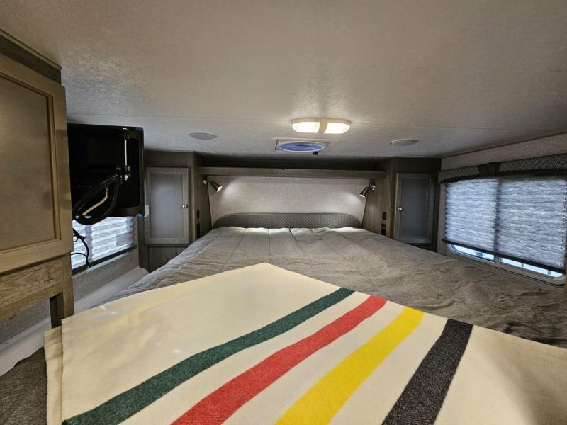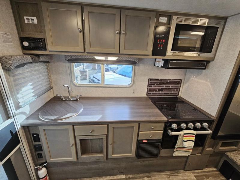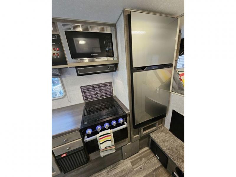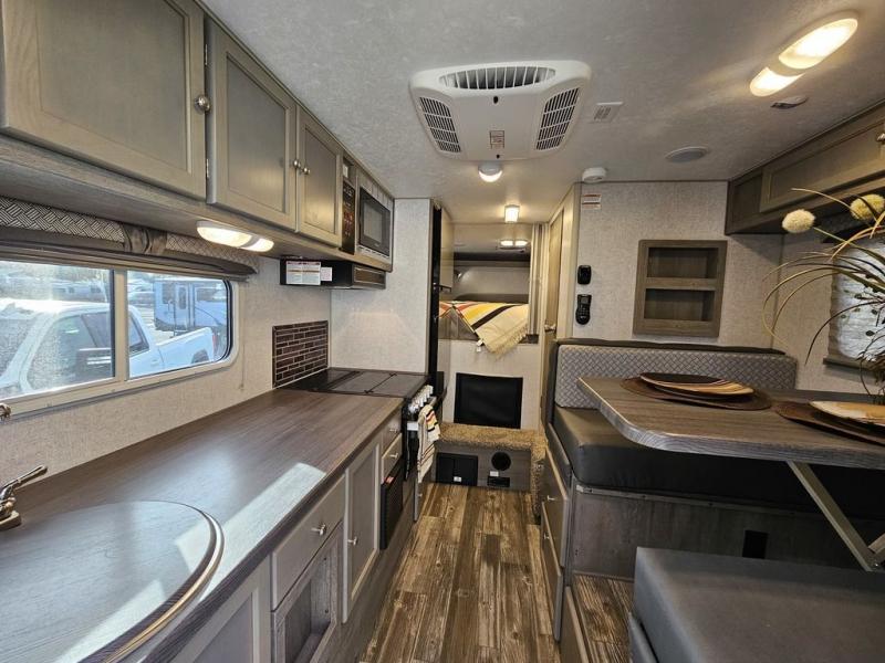 Make your weekend excursions easier than ever in this cozy truck camper for three to four. Since there is a 58" x 80" queen bed up front, you won't have to sleep on the floor, and your guests can sleep on the booth dinette that converts to a 40" x 72" sleeping area. Get cleaned up each day in the convenient wet bath that includes a medicine cabinet and an exhaust fan to keep everything fresh. There is a three burner cooktop and residential-style microwave with an air fryer to prepare meals each day, plus an 8 cu. ft. 12V refrigerator for perishables. This model also includes three wardrobes around the bed for more storage place plus a TV location if you want to add the optional 24" 12V LED TV!