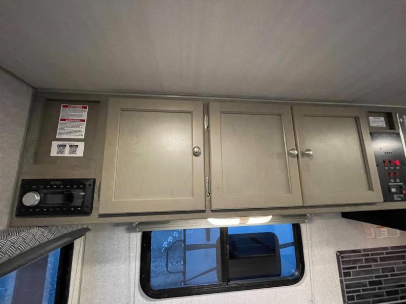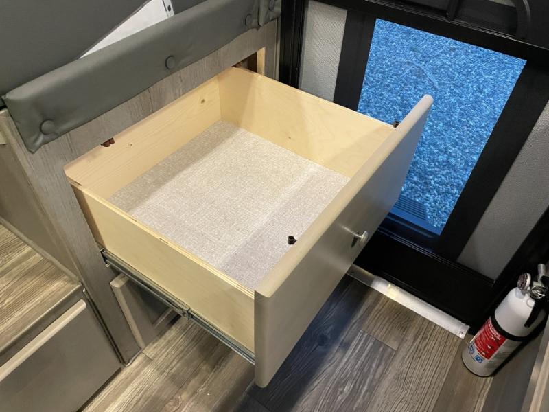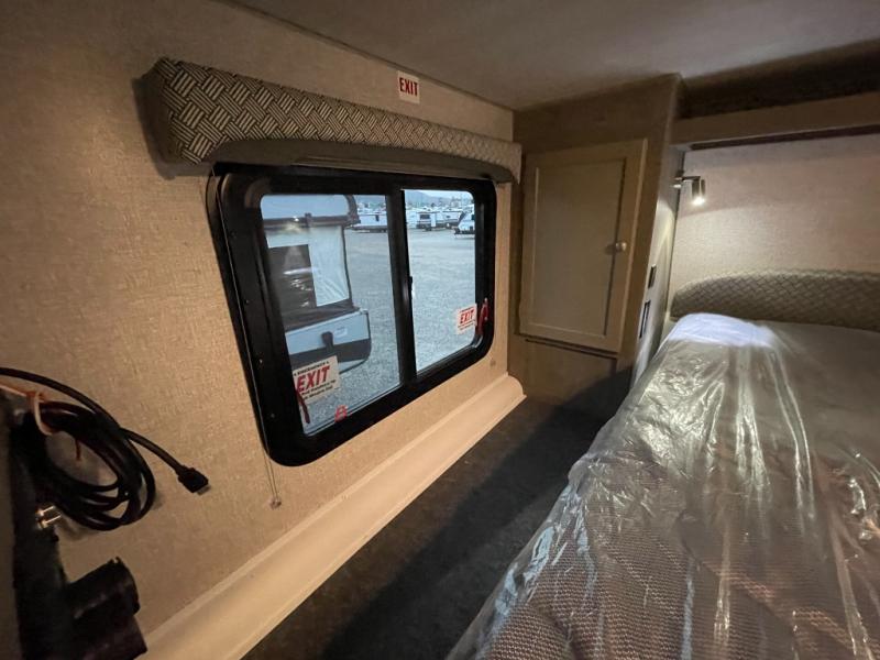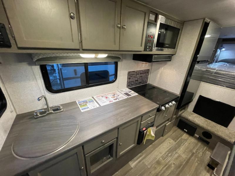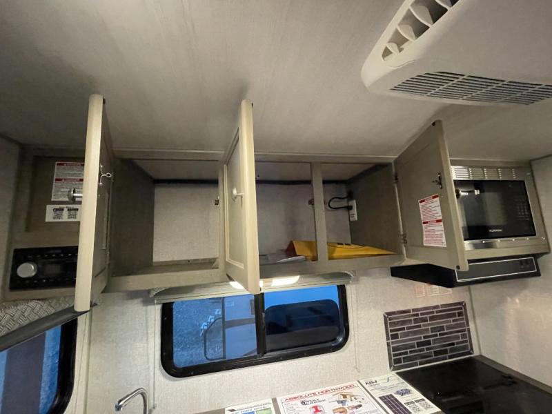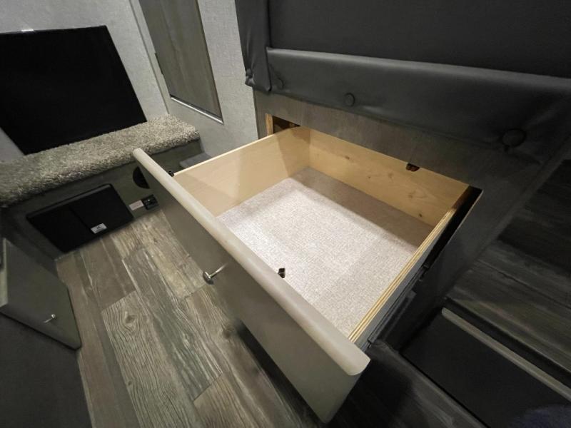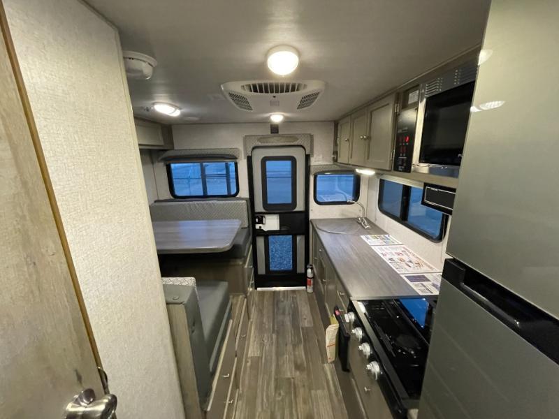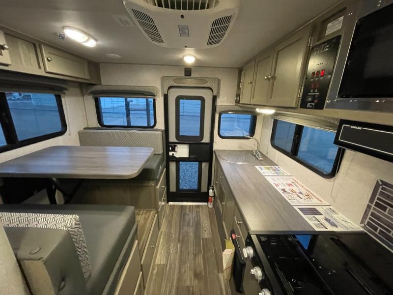 Make your weekend excursions easier than ever in this cozy truck camper for three to four. Since there is a 58" x 80" queen bed up front, you won't have to sleep on the floor, and your guests can sleep on the booth dinette that converts to a 40" x 72" sleeping area. Get cleaned up each day in the convenient wet bath that includes a medicine cabinet and an exhaust fan to keep everything fresh. There is a three burner cooktop and residential-style microwave with an air fryer to prepare meals each day, plus an 8 cu. ft. 12V refrigerator for perishables. This model also includes three wardrobes around the bed for more storage place plus a TV location if you want to add the optional 24" 12V LED TV!