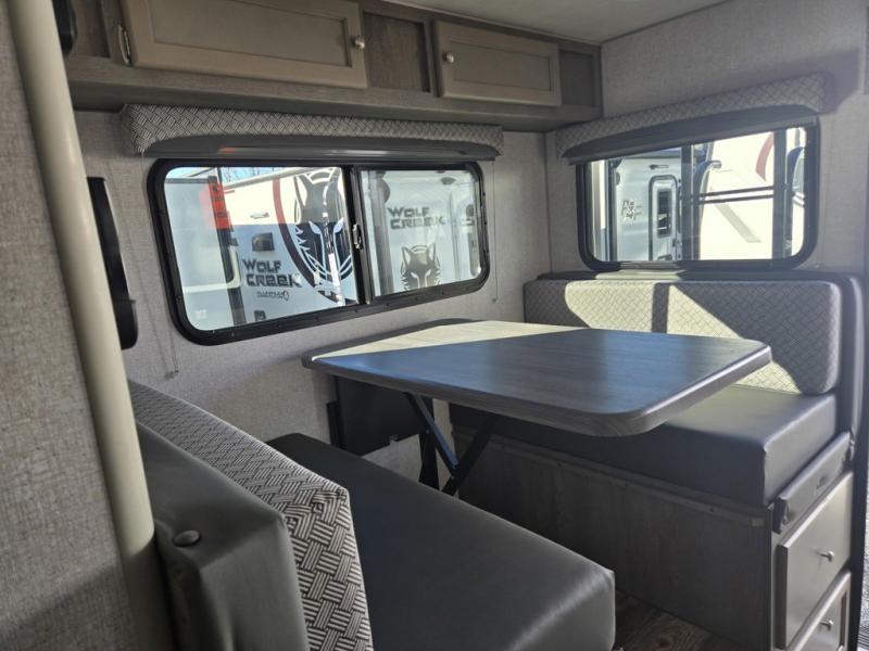 With any Wolf Creek truck camper by Northwood you can camp year around thanks to the high density block foam insulation, thermal pane windows, and the multi-layered substrate walls. The durable fully welded, thick-wall aluminum frame construction will add durability, and the Corona treated fiberglass will help combat leaks so you can enjoy your camper for years to come. Each model includes fabric night shade window treatments, custom one-piece formed countertops and dinette table, hardwood cabinet doors, and many more comforts. You will love the high value features included within the Wolf Pack, such as a Fox Landing ready rear bumper, a premium vent, electric jacks, and outside speakers.