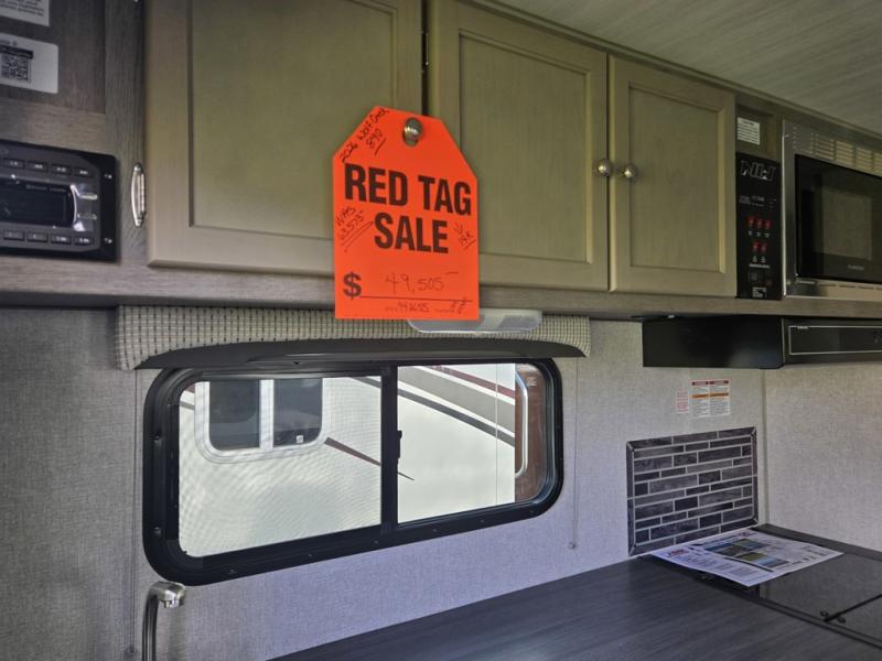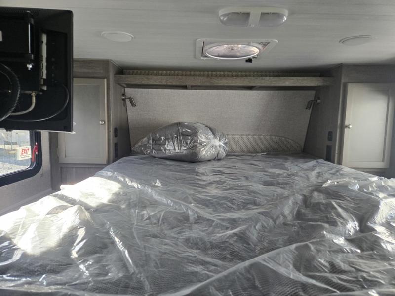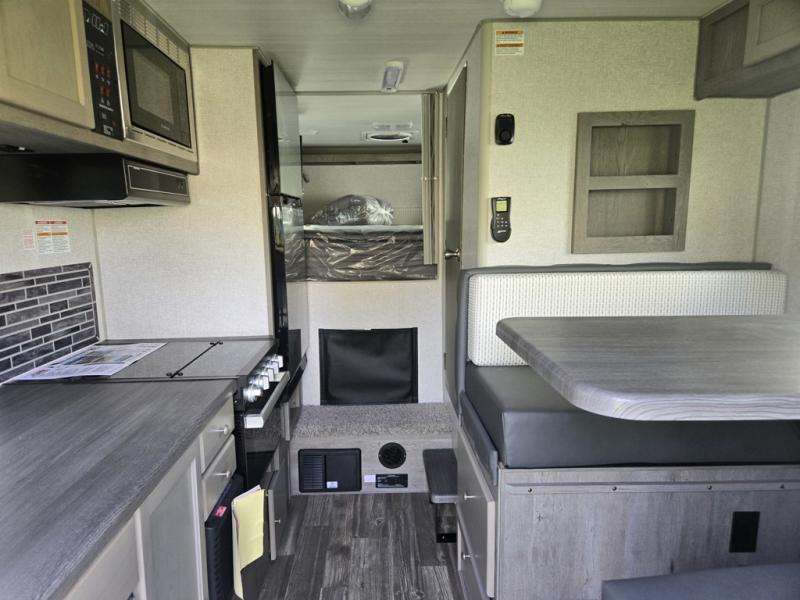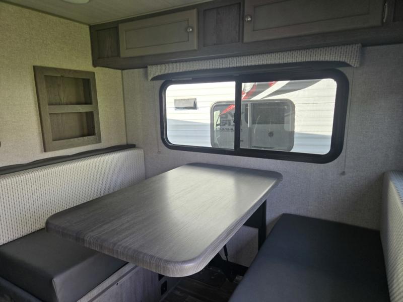 Make your weekend excursions easier than ever in this cozy truck camper for three to four. Since there is a 58" x 80" queen bed up front, you won't have to sleep on the floor, and your guests can sleep on the booth dinette that converts to a 40" x 72" sleeping area. Get cleaned up each day in the convenient wet bath that includes a medicine cabinet and an exhaust fan to keep everything fresh. There is a three burner cooktop and residential-style microwave with an air fryer to prepare meals each day, plus an 8 cu. ft. 12V refrigerator for perishables. This model also includes three wardrobes around the bed for more storage place plus a TV location if you want to add the optional 24" 12V LED TV!