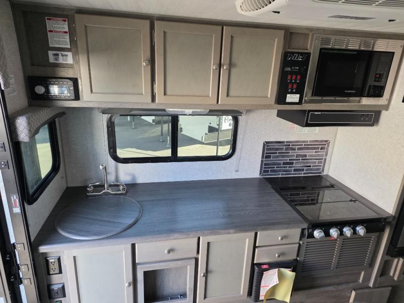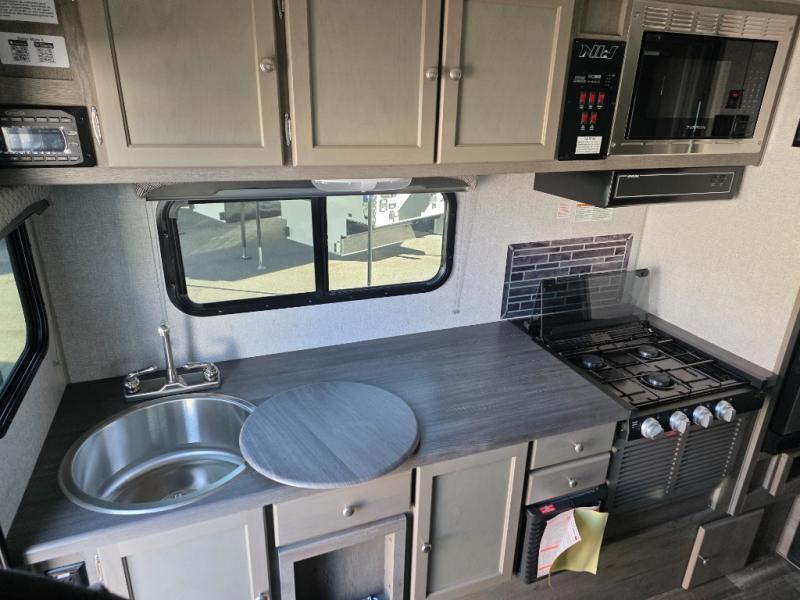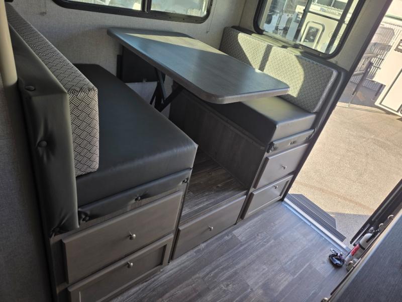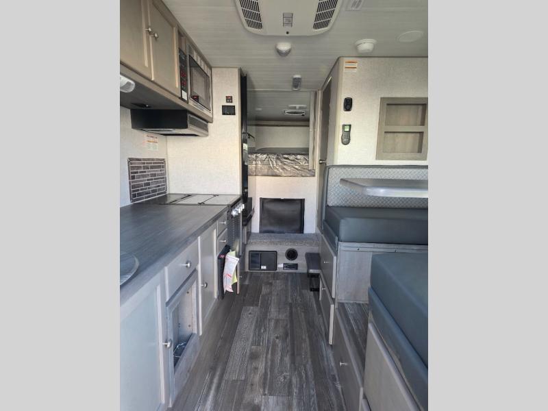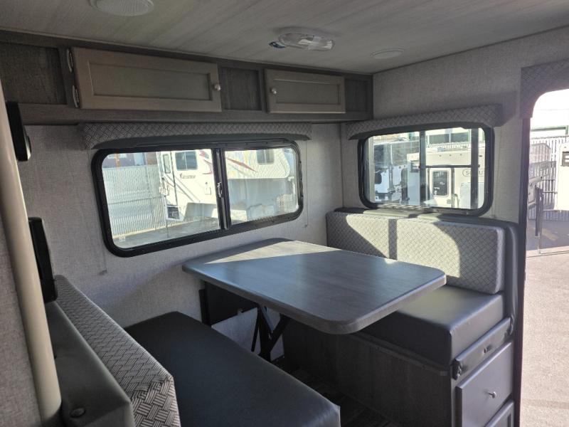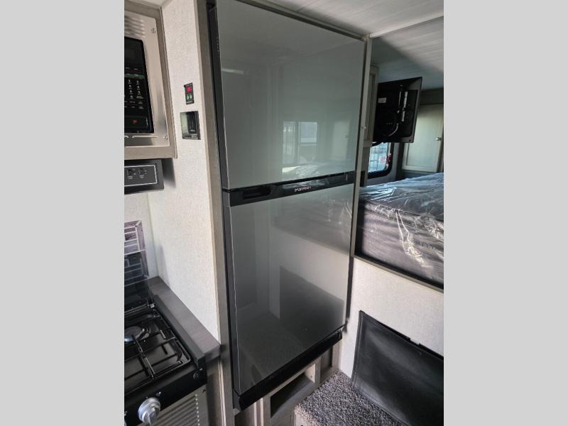 Make your weekend excursions easier than ever in this cozy truck camper for three to four. Since there is a 58" x 80" queen bed up front, you won't have to sleep on the floor, and your guests can sleep on the booth dinette that converts to a 40" x 72" sleeping area. Get cleaned up each day in the convenient wet bath that includes a medicine cabinet and an exhaust fan to keep everything fresh. There is a three burner cooktop and residential-style microwave with an air fryer to prepare meals each day, plus an 8 cu. ft. 12V refrigerator for perishables. This model also includes three wardrobes around the bed for more storage place plus a TV location if you want to add the optional 24" 12V LED TV!