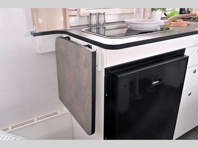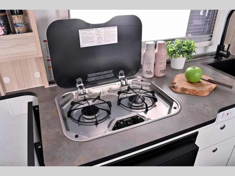 You'll find comfort wherever you camp in this travel trailer! Once you arrive at your campsite, you can unload the pass-through storage, put out the 12' awning, and relax in your camp chairs. There is a two-burner glass stove top and microwave oven inside that will allow you to make lunch for your crew, and there is a 4.6 cu. ft. 12V compressor refrigerator to keep your food fresh. The 4-peson U-shaped dinette will provide a place to dine together and convert to sleeping space for one to two more. Up front, a walk-around queen bed will provide a great night's rest.