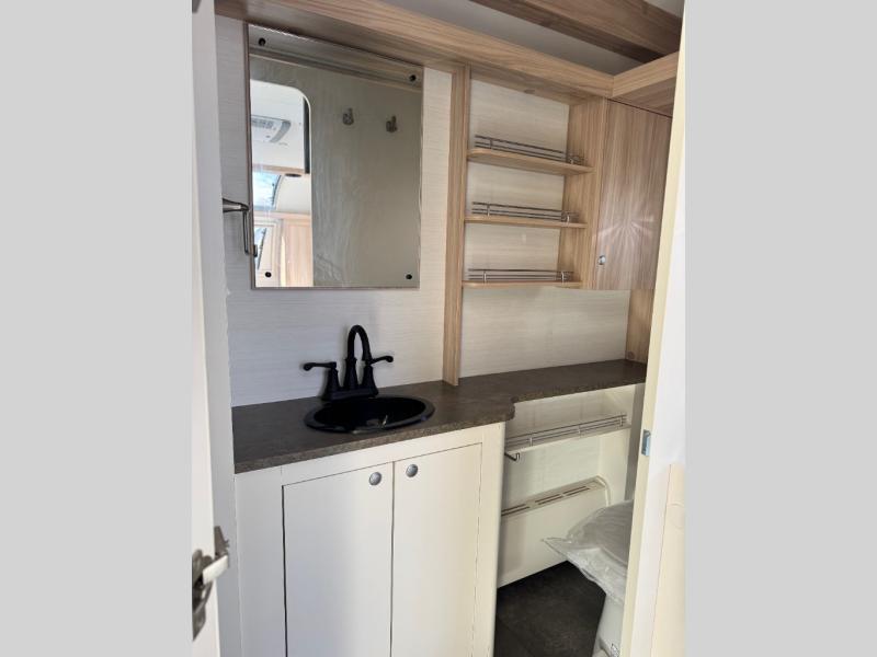 With any Haven travel trailer by nuCamp RV, you can make each destination your home on the road sanctuary! Handcrafted in Ohio's Amish country, you will be pleased with the impeccable craftsmanship and functionality. The Convenience Package features an electric tongue jack with a courtesy light, a roof top solar panel, an external solar port, a backup camera, and a 100Ah 12V lithium battery to keep you powered up. Each model also includes an external LP hook-up, a rear hitch receiver, an XL storage tub, plus an entry door handle and double step for added stability when entering the unit. Inside, you'll enjoy premium soft-close cabinetry, Stargazer windows, composite flooring, and a 24" wide entry door with an integrated screen door to name just a few comforts!