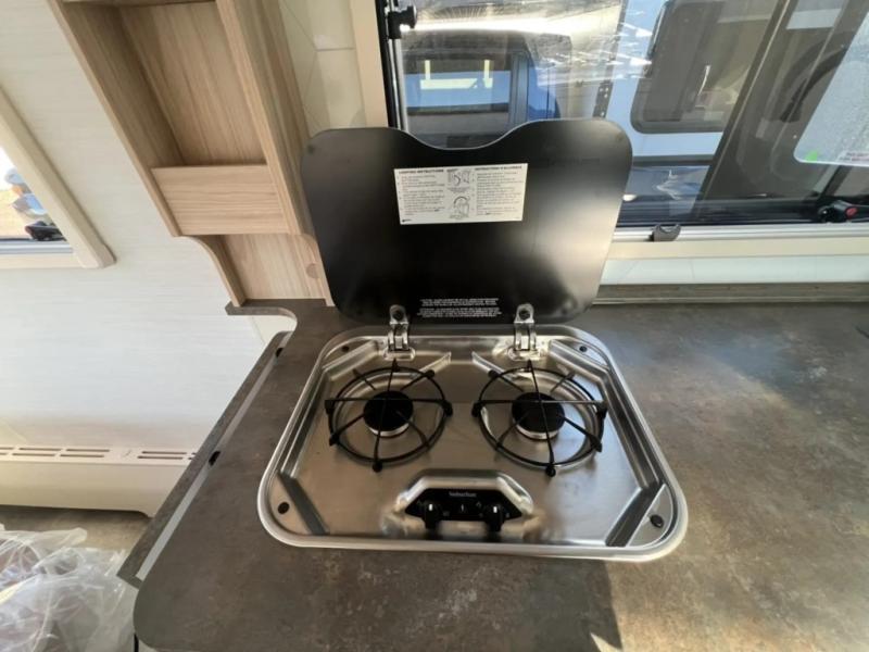 You'll find comfort wherever you camp in this travel trailer! Once you arrive at your campsite, you can unload the pass-through storage, put out the 12' awning, and relax in your camp chairs. There is a two-burner glass stove top and microwave oven inside that will allow you to make lunch for your crew, and there is a 4.6 cu. ft. 12V compressor refrigerator to keep your food fresh. The 4-peson U-shaped dinette will provide a place to dine together and convert to sleeping space for one to two more. Up front, a walk-around queen bed will provide a great night's rest.