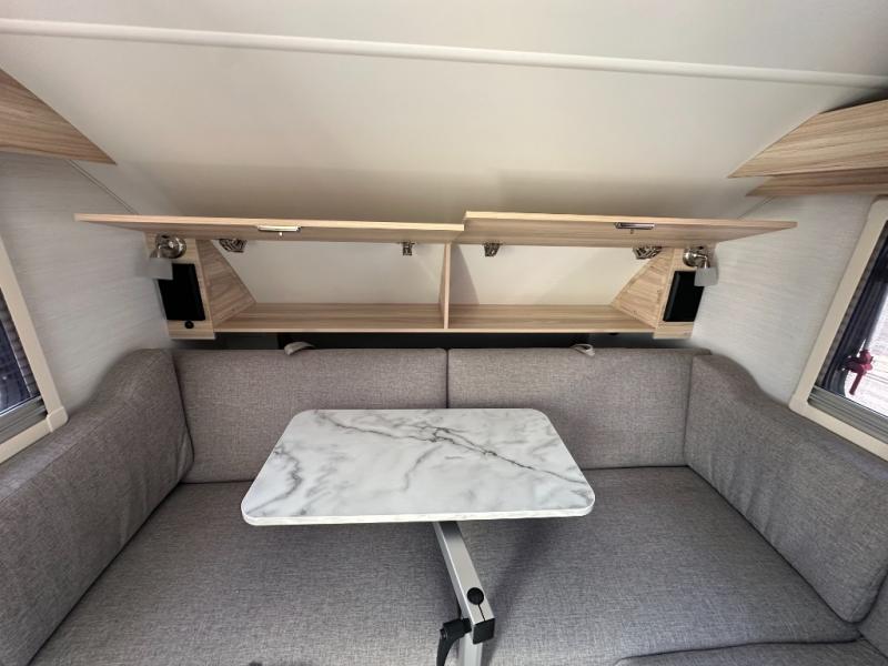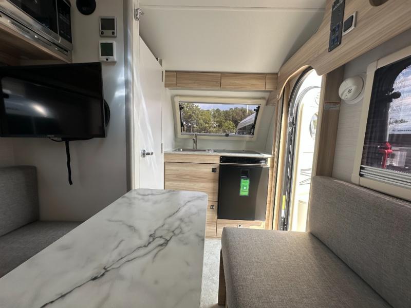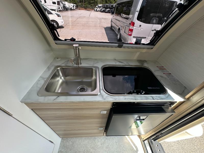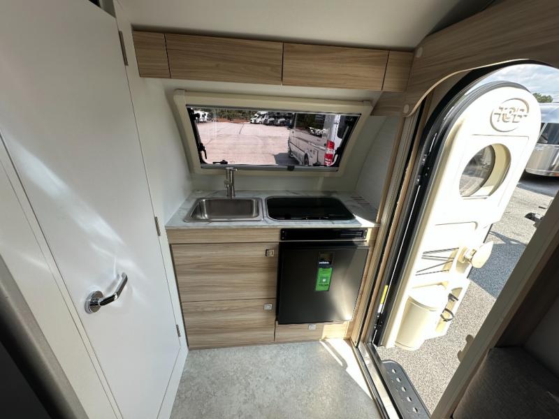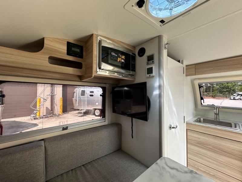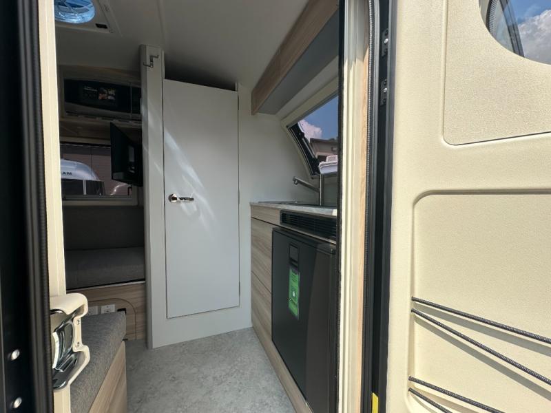With any TAB 320 teardrop trailer by nüCamp RV, the interior offers premium soft-close cabinetry, a front window, plus a wet bath with a cassette toilet and a molded sink. They are also built with composite flooring and a molded underbelly shield for protection against rock and debris during your journeys. The iconic teardrop design offers an easy-to-tow unit with amenities found in much bigger trailers. Some other highlights include the Alde heating/hot water system, the central air conditioner, 180 watt solar panel, and the Nautilus water system with an external shower.