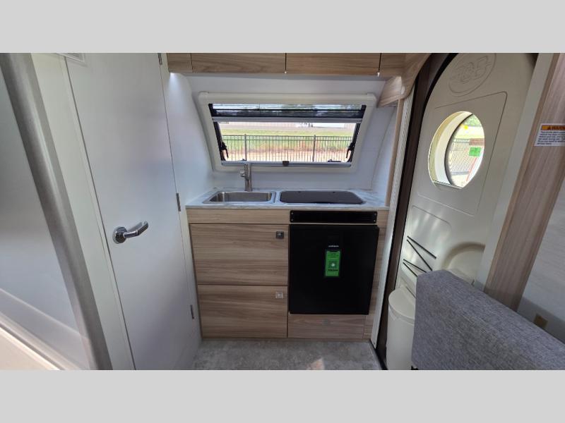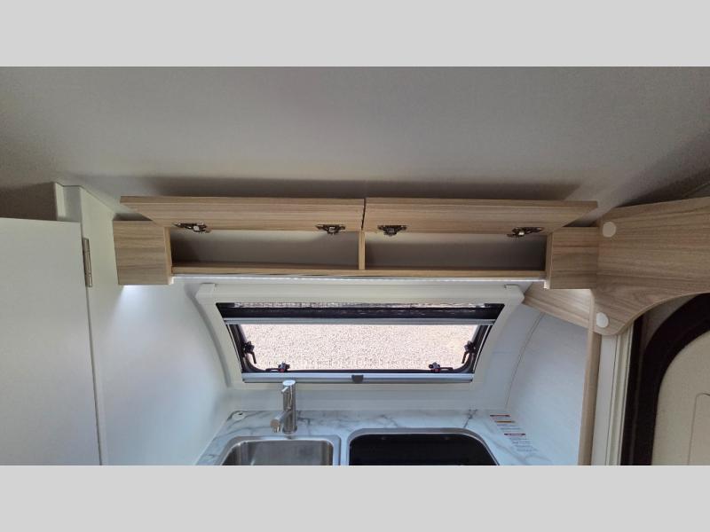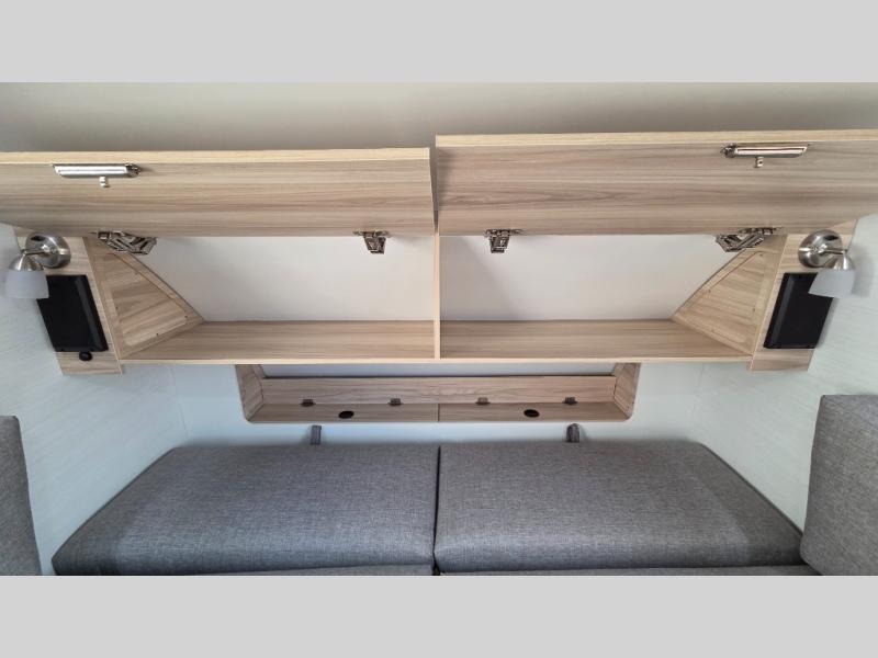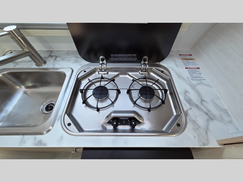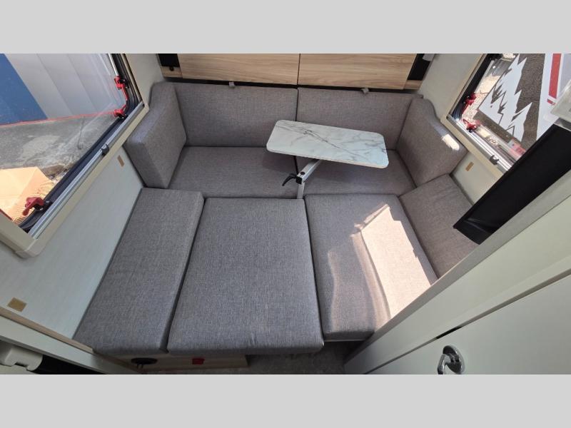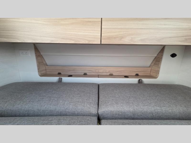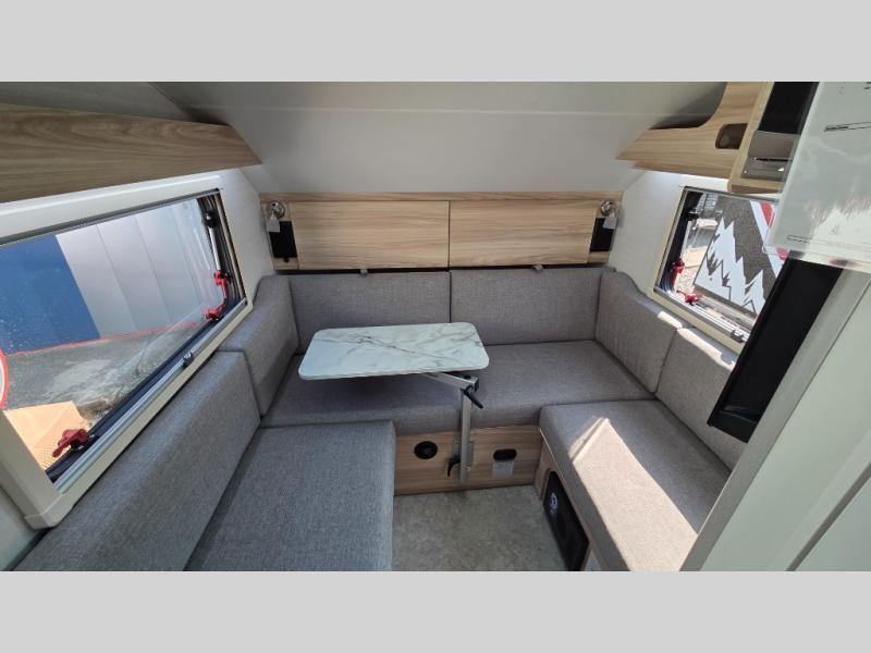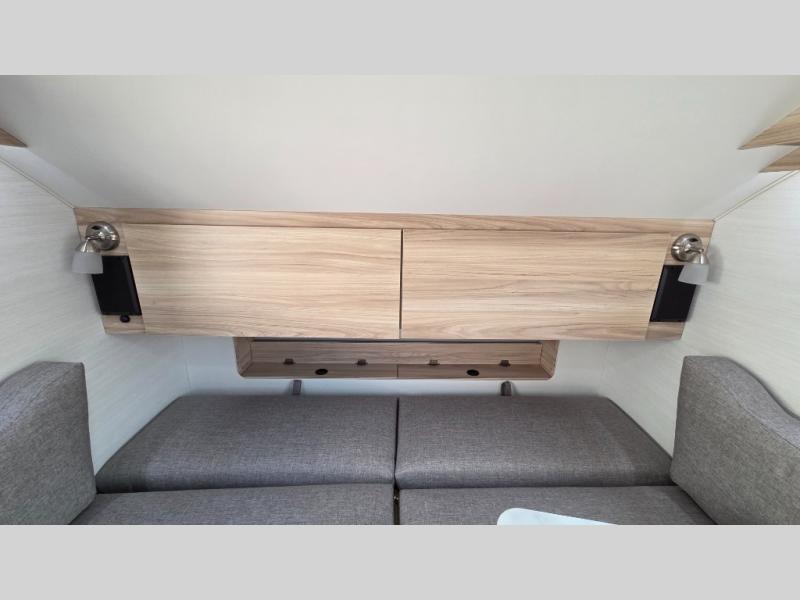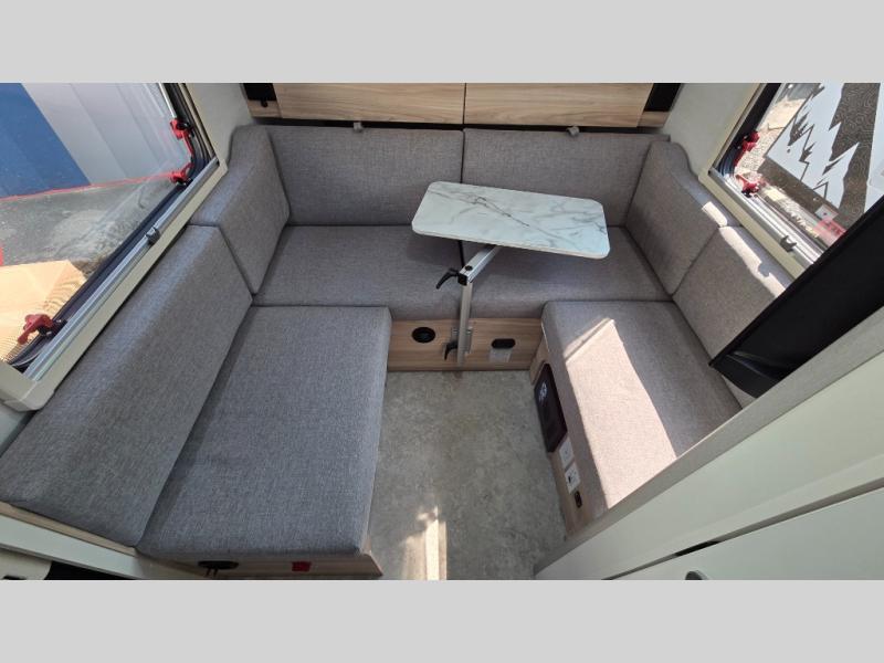 With any TAB 320 teardrop trailer by nuCamp RV, the interior offers premium soft-close cabinetry, a front window, plus a wet bath with a cassette toilet and a molded sink. They are also built with composite flooring and a molded underbelly shield for protection against rock and debris during your journeys. The iconic teardrop design offers an easy-to-tow unit with amenities found in much bigger trailers. Some other highlights include the Alde heating/hot water system, the central air conditioner, 180-watt solar panel, and the Nautilus water system with an external shower.