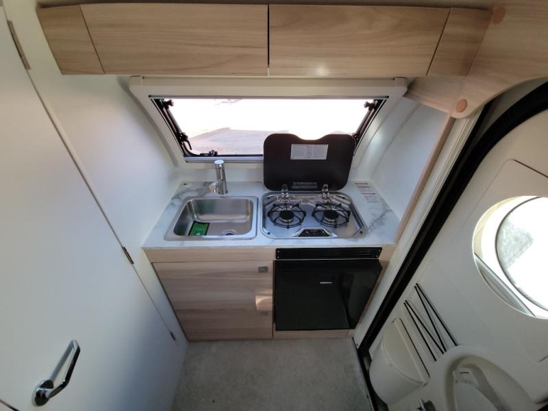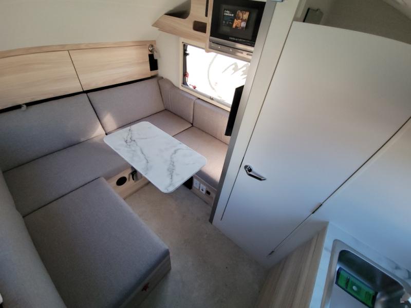 With any TAB 320 teardrop trailer by nuCamp RV, the interior offers premium soft-close cabinetry, a front window, plus a wet bath with a cassette toilet and a molded sink. They are also built with composite flooring and a molded underbelly shield for protection against rock and debris during your journeys. The iconic teardrop design offers an easy-to-tow unit with amenities found in much bigger trailers. Some other highlights include the Alde heating/hot water system, the central air conditioner, 180-watt solar panel, and the Nautilus water system with an external shower.