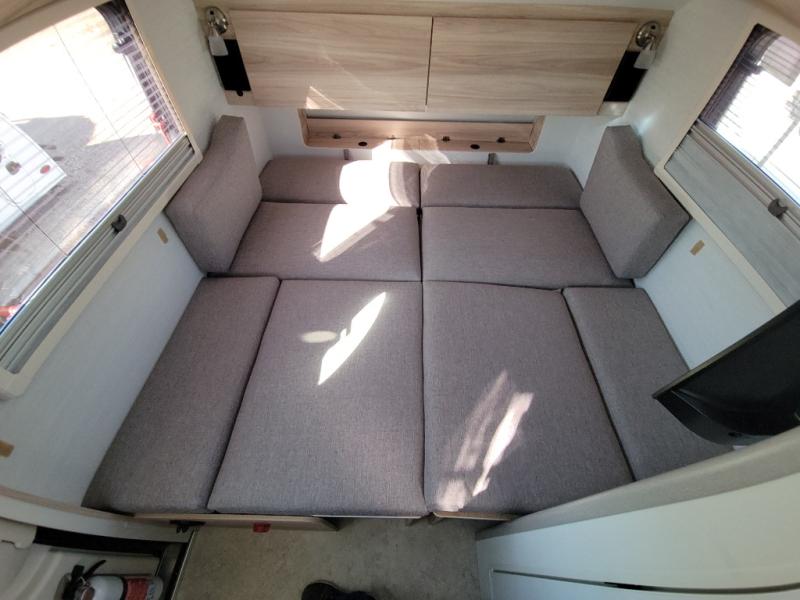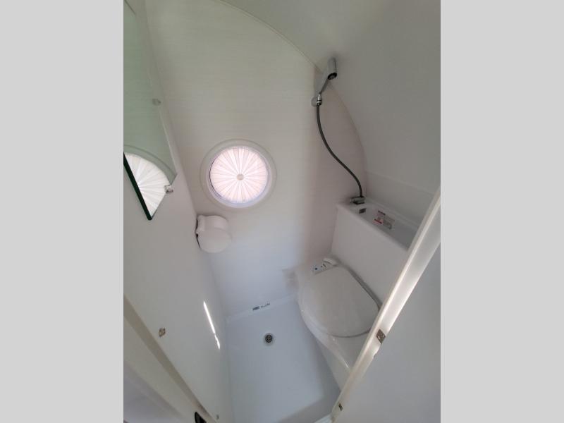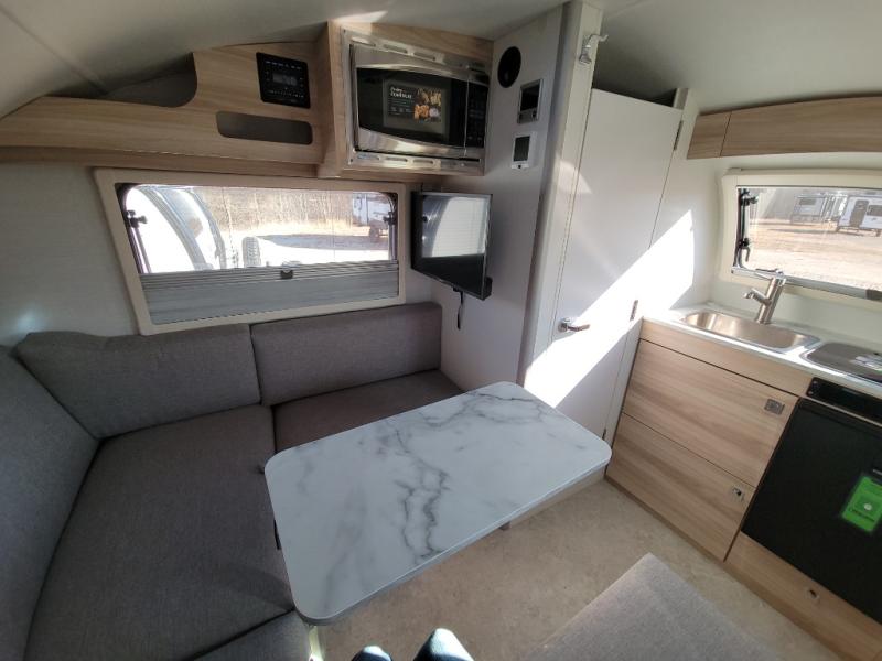 With any TAB 320 teardrop trailer by nuCamp RV, the interior offers premium soft-close cabinetry, a front window, plus a wet bath with a cassette toilet and a molded sink. They are also built with composite flooring and a molded underbelly shield for protection against rock and debris during your journeys. The iconic teardrop design offers an easy-to-tow unit with amenities found in much bigger trailers. Some other highlights include the Alde heating/hot water system, the central air conditioner, 180-watt solar panel, and the Nautilus water system with an external shower.