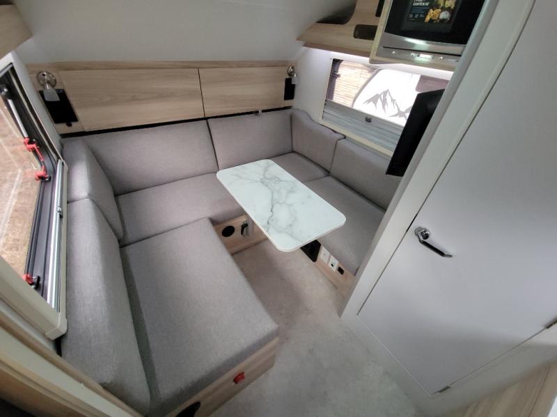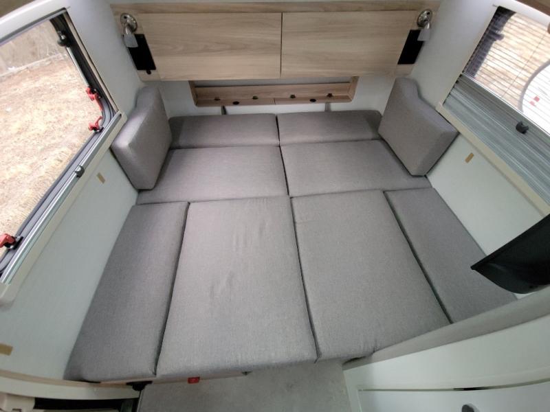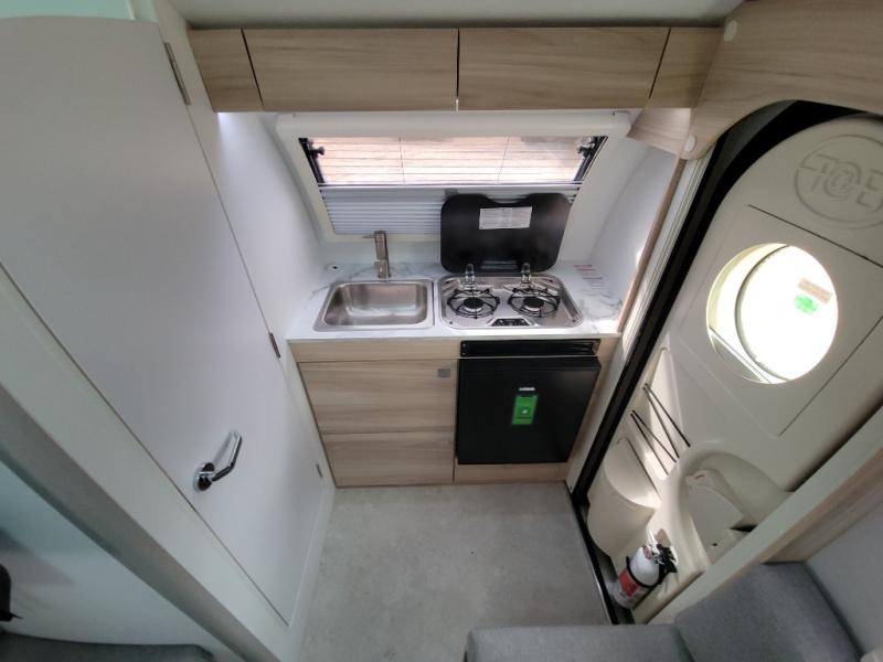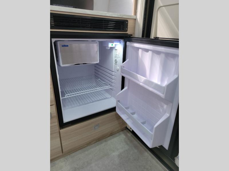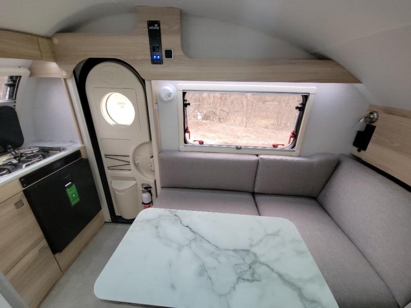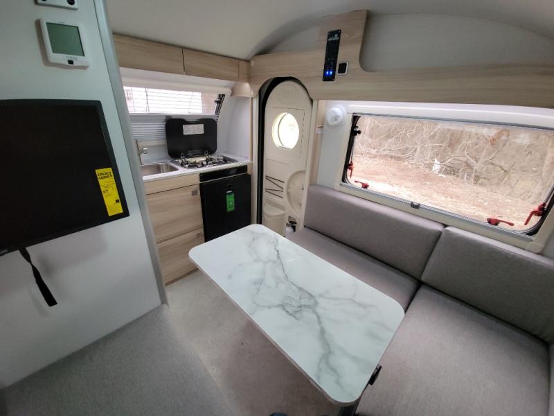 With any TAB 320 teardrop trailer by nuCamp RV, the interior offers premium soft-close cabinetry, a front window, plus a wet bath with a cassette toilet and a molded sink. They are also built with composite flooring and a molded underbelly shield for protection against rock and debris during your journeys. The iconic teardrop design offers an easy-to-tow unit with amenities found in much bigger trailers. Some other highlights include the Alde heating/hot water system, the central air conditioner, 180-watt solar panel, and the Nautilus water system with an external shower.