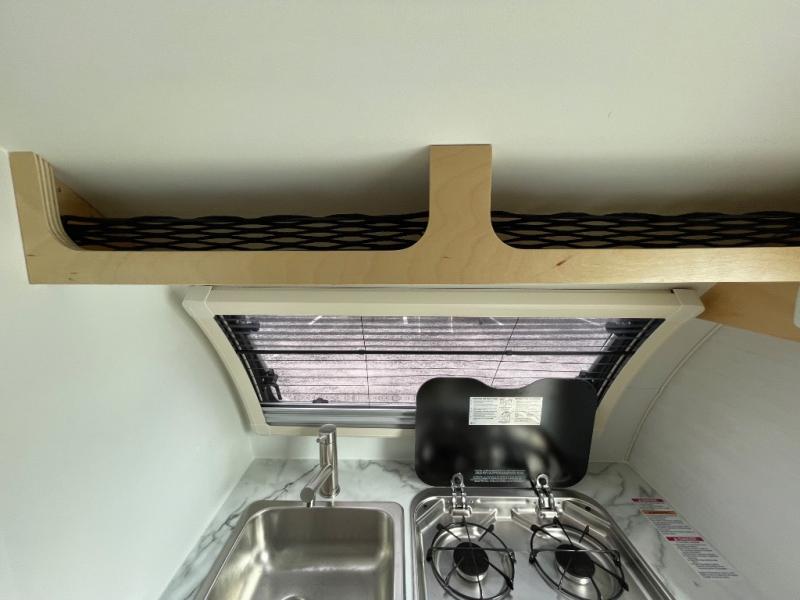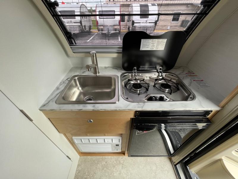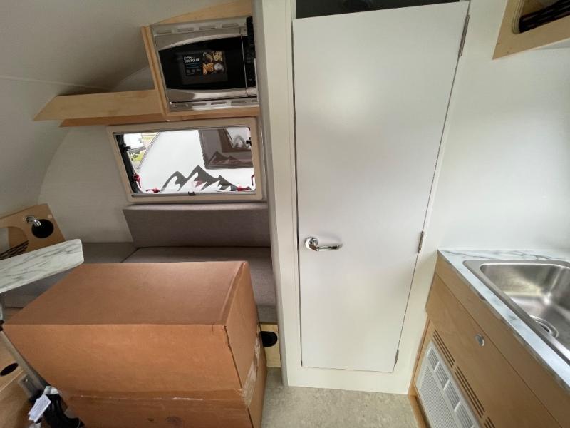 Hitch up and go at the drop of a hat with this cozy teardrop trailer! You will love how easy it will be to tow this unit, and you'll be surprised to find everything you need for hassle-free camping trips. An expandable split bed/dinette provides a place to relax, eat and sleep, and a two burner stove with a glass top will let you make meals inside when you don't want to cook over the campfire. You can choose to add an optional microwave for even more convenience, and the standard 12V compressor refrigerator will keep your cold items fresh. Easily freshen up each day in the wet bath that includes a cassette toilet with a molded sink.