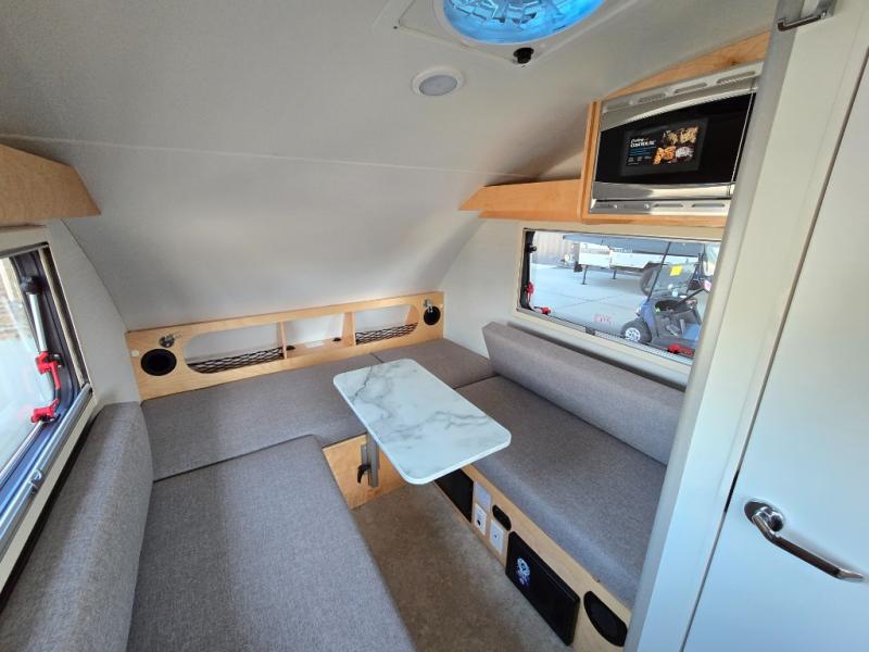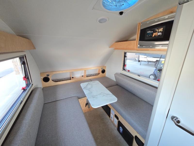 The TAB 320 LITE teardrop trailer by nuCamp RV offers a simple, more affordable, and more approachable way of camping. There is a molded underbelly shield, alloy wheels, aggressive off-road tires, plus Boondock molded fenders and a Boondock entry door handle and step. A front diamond plate storage tub will keep your camp gear secure, and a 180-watt solar panel will provide off-grid capabilities. This teardrop trailer features an LP furnace and an A/C unit, along with an LP water heater for added comfort. Inside, you will love the premium soft-close cabinetry, composite flooring, side porthole windows, and front window for great outdoor views.