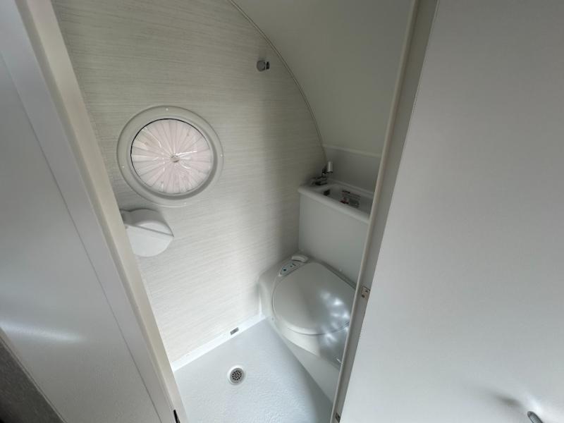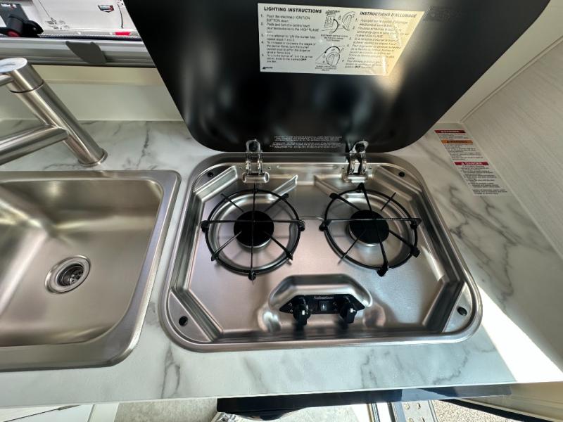 Hitch up and go at the drop of a hat with this cozy teardrop trailer! You will love how easy it will be to tow this unit, and you'll be surprised to find everything you need for hassle-free camping trips. An expandable split bed/dinette provides a place to relax, eat and sleep, and a two burner stove with a glass top will let you make meals inside when you don't want to cook over the campfire. You can choose to add an optional microwave for even more convenience, and the standard 12V compressor refrigerator will keep your cold items fresh. Easily freshen up each day in the wet bath that includes a cassette toilet with a molded sink.