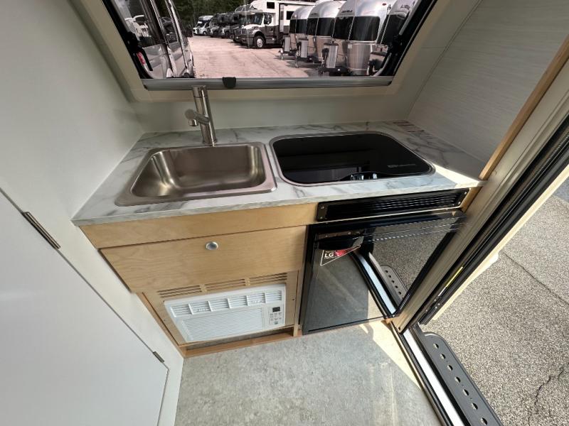 The TAB 320 LITE teardrop trailer by nuCamp RV offers a simple, more affordable, and more approachable way of camping. There is a molded underbelly shield, alloy wheels, aggressive off-road tires, plus Boondock molded fenders and a Boondock entry door handle and step. A front diamond plate storage tub will keep your camp gear secure, and a 180-watt solar panel will provide off-grid capabilities. This teardrop trailer features an LP furnace and an A/C unit, along with an LP water heater for added comfort. Inside, you will love the premium soft-close cabinetry, composite flooring, side porthole windows, and front window for great outdoor views.