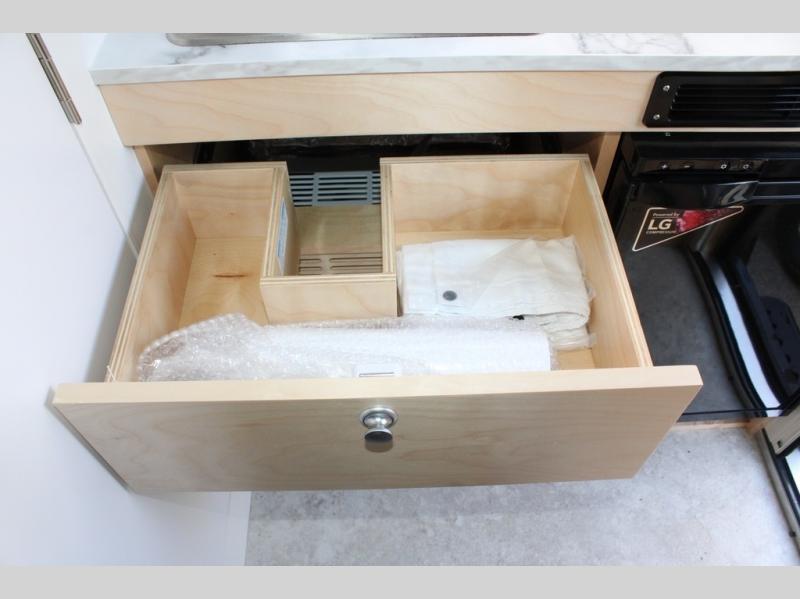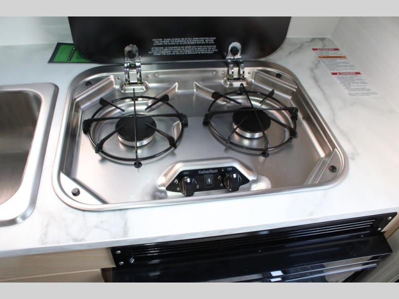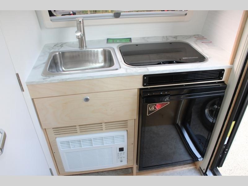 Hitch up and go at the drop of a hat with this cozy teardrop trailer! You will love how easy it will be to tow this unit, and you'll be surprised to find everything you need for hassle-free camping trips. An expandable split bed/dinette provides a place to relax, eat and sleep, and a two-burner stove with a glass top will let you make meals inside when you don't want to cook over the campfire. You can choose to add an optional microwave for even more convenience, and the standard 12V compressor refrigerator will keep your cold items fresh. Easily freshen up each day in the wet bath that includes a cassette toilet with a molded sink.