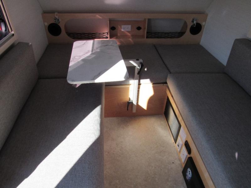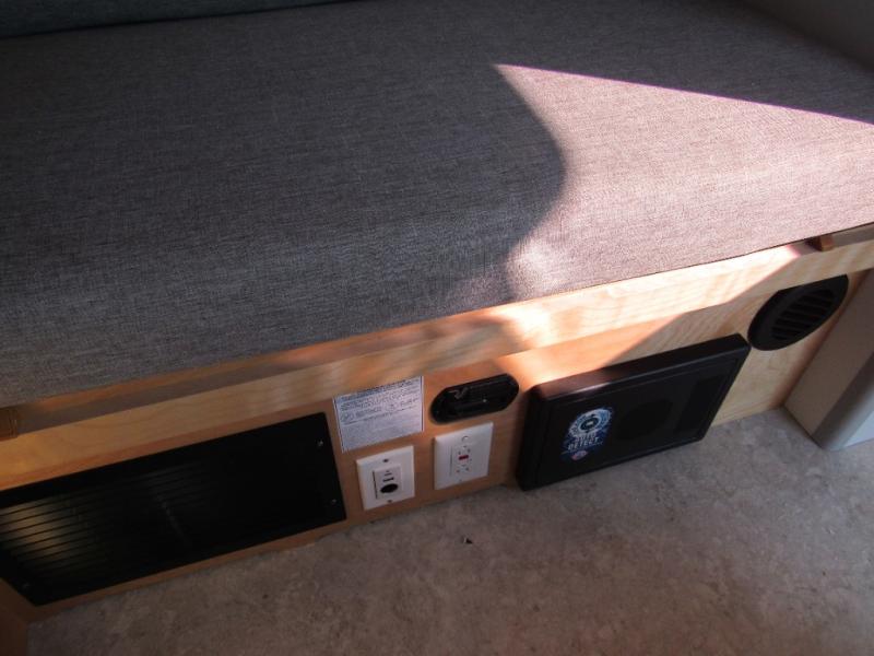 The TAB 320 LITE teardrop trailer by nuCamp RV offers a simple, more affordable, and more approachable way of camping. There is a molded underbelly shield, alloy wheels, aggressive off-road tires, plus Boondock molded fenders and a Boondock entry door handle and step. A front diamond plate storage tub will keep your camp gear secure, and a 120-watt solar panel will provide off-grid capabilities. This teardrop trailer features an LP furnace and an A/C unit, along with an LP water heater for added comfort. Inside, you will love the premium soft-close cabinetry, composite flooring, side porthole windows, and front window for great outdoor views.