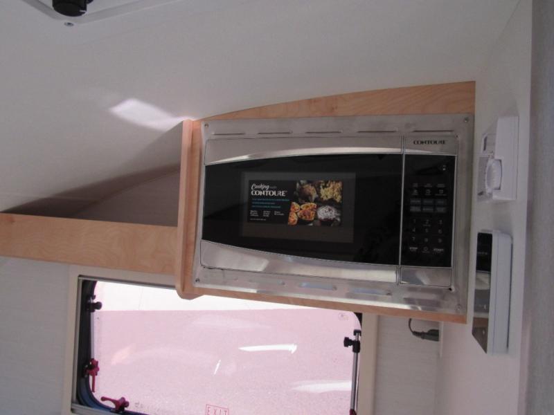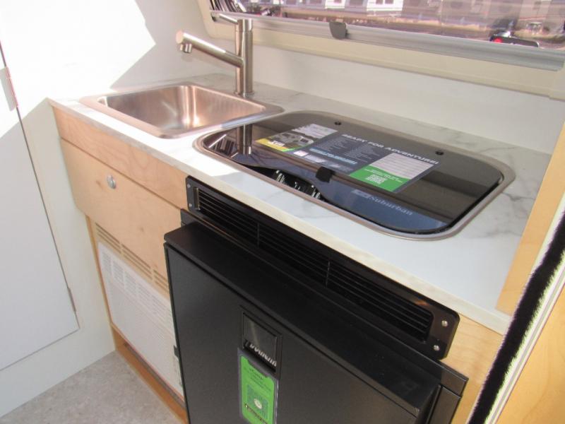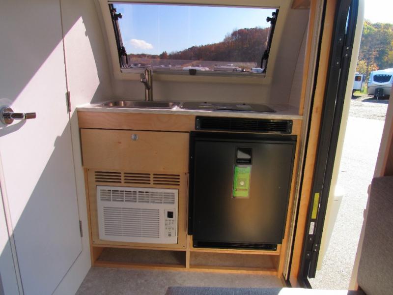 Hitch up and go at the drop of a hat with this cozy teardrop trailer! You will love how easy it will be to tow this unit, and you'll be surprised to find everything you need for hassle-free camping trips. An expandable split bed/dinette provides a place to relax, eat and sleep, and a two-burner stove with a glass top will let you make meals inside when you don't want to cook over the campfire. You can choose to add an optional microwave for even more convenience, and the standard 12V compressor refrigerator will keep your cold items fresh. Easily freshen up each day in the wet bath that includes a cassette toilet with a molded sink.