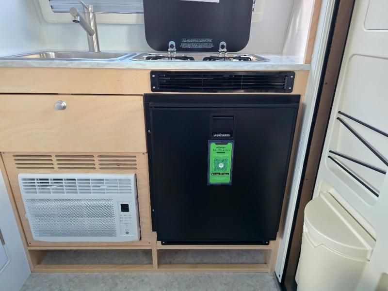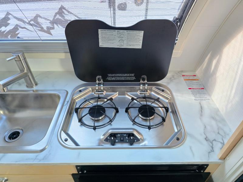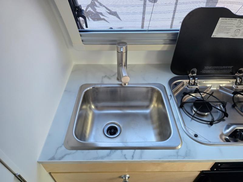 Hitch up and go at the drop of a hat with this cozy teardrop trailer! You will love how easy it will be to tow this unit, and you'll be surprised to find everything you need for hassle-free camping trips. An expandable split bed/dinette provides a place to relax, eat and sleep, and a two-burner stove with a glass top will let you make meals inside when you don't want to cook over the campfire. You can choose to add an optional microwave for even more convenience, and the standard 12V compressor refrigerator will keep your cold items fresh. Easily freshen up each day in the wet bath that includes a cassette toilet with a molded sink.