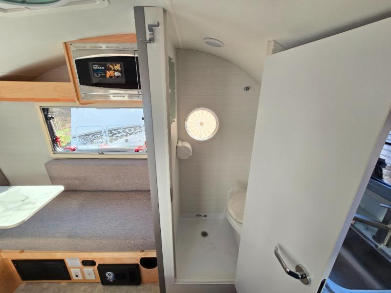 The TAB 320 LITE teardrop trailer by nuCamp RV offers a simple, more affordable, and more approachable way of camping. There is a molded underbelly shield, alloy wheels, aggressive off-road tires, plus Boondock molded fenders and a Boondock entry door handle and step. A front diamond plate storage tub will keep your camp gear secure, and a 120-watt solar panel will provide off-grid capabilities. This teardrop trailer features an LP furnace and an A/C unit, along with an LP water heater for added comfort. Inside, you will love the premium soft-close cabinetry, composite flooring, side porthole windows, and front window for great outdoor views.