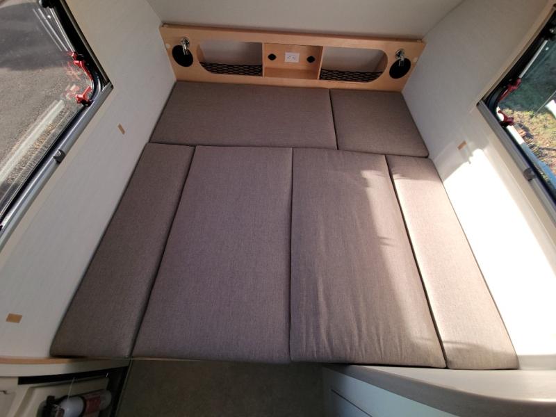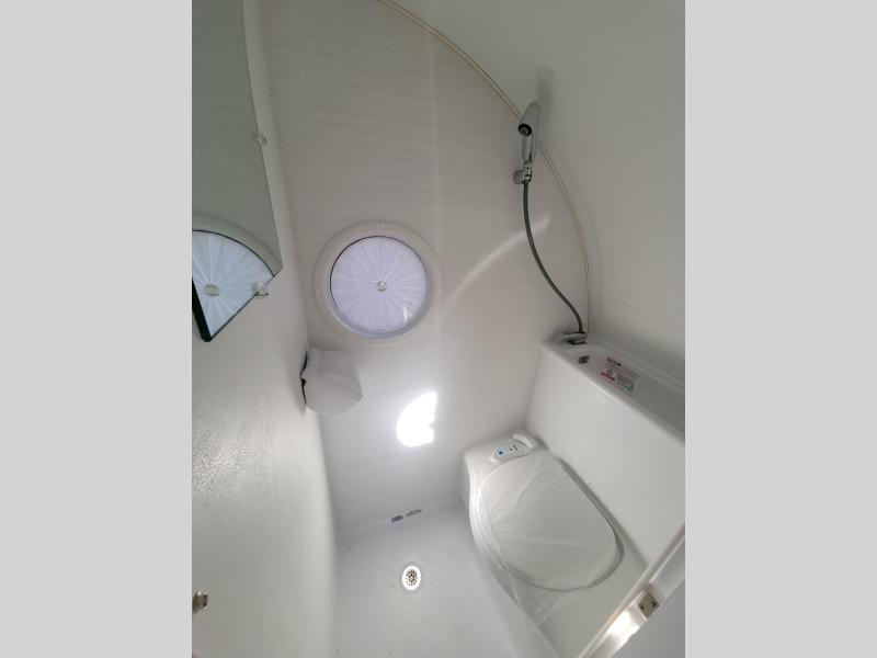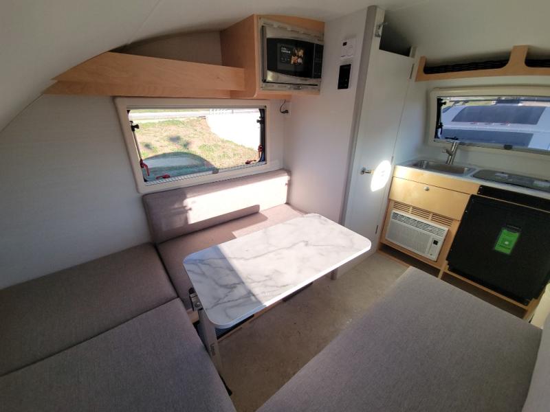 Hitch up and go at the drop of a hat with this cozy teardrop trailer! You will love how easy it will be to tow this unit, and you'll be surprised to find everything you need for hassle-free camping trips. An expandable split bed/dinette provides a place to relax, eat and sleep, and a two-burner stove with a glass top will let you make meals inside when you don't want to cook over the campfire. You can choose to add an optional microwave for even more convenience, and the standard 12V compressor refrigerator will keep your cold items fresh. Easily freshen up each day in the wet bath that includes a cassette toilet with a molded sink.
