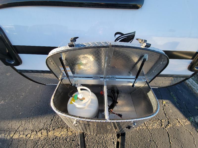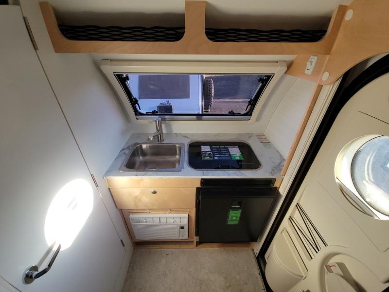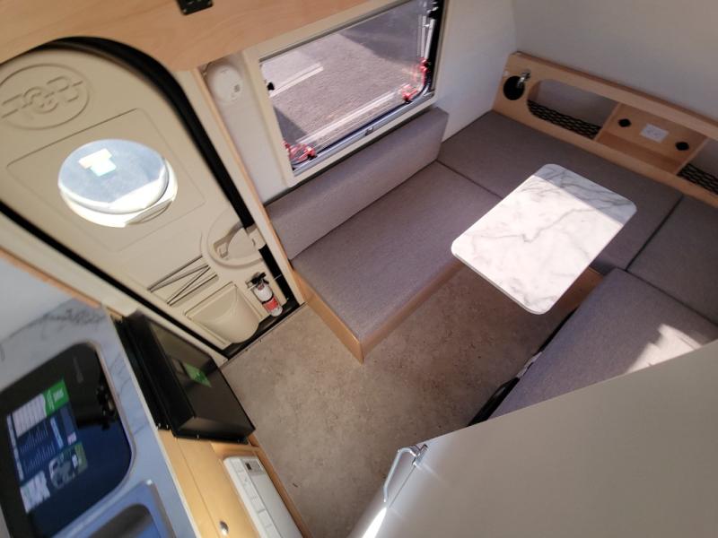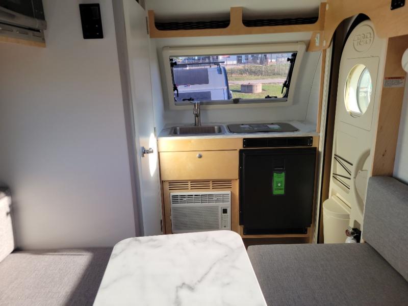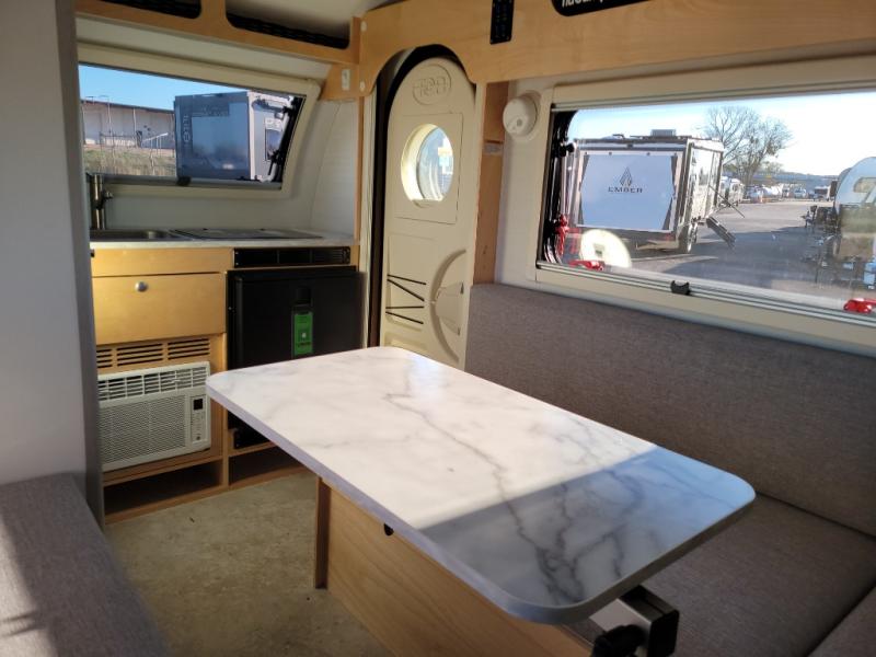 The TAB 320 LITE teardrop trailer by nuCamp RV offers a simple, more affordable, and more approachable way of camping. There is a molded underbelly shield, alloy wheels, aggressive off-road tires, plus Boondock molded fenders and a Boondock entry door handle and step. A front diamond plate storage tub will keep your camp gear secure, and a 120-watt solar panel will provide off-grid capabilities. This teardrop trailer features an LP furnace and an A/C unit, along with an LP water heater for added comfort. Inside, you will love the premium soft-close cabinetry, composite flooring, side porthole windows, and front window for great outdoor views.