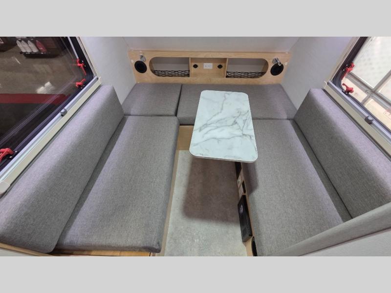 Hitch up and go at the drop of a hat with this cozy teardrop trailer! You will love how easy it will be to tow this unit, and you'll be surprised to find everything you need for hassle-free camping trips. An expandable split bed/dinette provides a place to relax, eat and sleep, and a two-burner stove with a glass top will let you make meals inside when you don't want to cook over the campfire. You can choose to add an optional microwave for even more convenience, and the standard 12V compressor refrigerator will keep your cold items fresh. Easily freshen up each day in the wet bath that includes a cassette toilet with a molded sink.