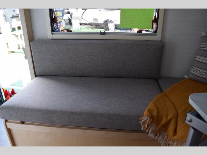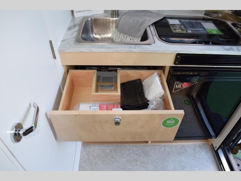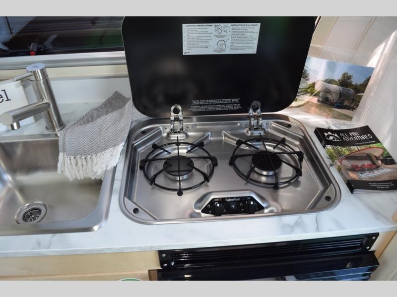 Hitch up and go at the drop of a hat with this cozy teardrop trailer! You will love how easy it will be to tow this unit, and you'll be surprised to find everything you need for hassle-free camping trips. An expandable split bed/dinette provides a place to relax, eat and sleep, and a two-burner stove with a glass top will let you make meals inside when you don't want to cook over the campfire. You can choose to add an optional microwave for even more convenience, and the standard 12V compressor refrigerator will keep your cold items fresh. Easily freshen up each day in the wet bath that includes a cassette toilet with a molded sink.