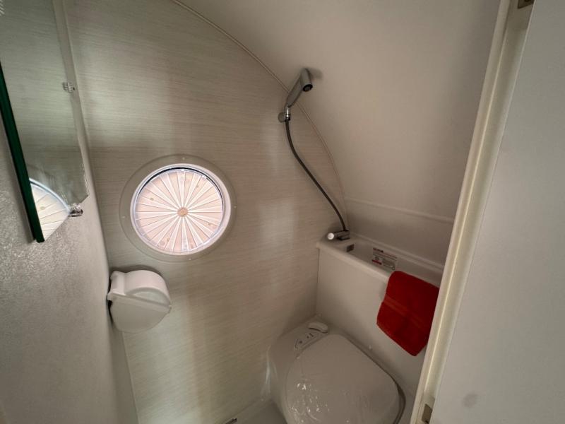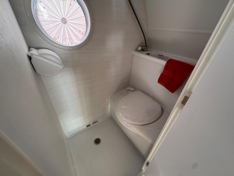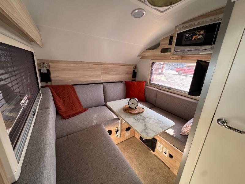 With any TAB 320 teardrop trailer by nuCamp RV, the interior offers premium soft-close cabinetry, a front window, plus a wet bath with a cassette toilet and a molded sink. They are also built with composite flooring and a molded underbelly shield for protection against rock and debris during your journeys. The iconic teardrop design offers an easy-to-tow unit with amenities found in much bigger trailers. Some other highlights include the Alde heating/hot water system, the central air conditioner, 180-watt solar panel, and the Nautilus water system with an external shower.