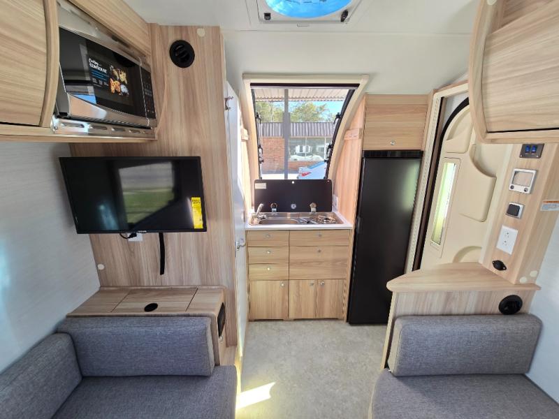 If you enjoy lightweight camping, this teardrop trailer is for you! Everything you need for trips to the lake will be right there with you, including a convenient wet bath with a cassette toilet. The twin bed set up gives you cozy sleeping space, and they can convert to a dinette on one side with extra seating on the other side! There are stargazer windows to give you great views of your surroundings, and the open floorplan will have you feeling right at home. A glass top sink and two burner cooktop combo will let you cook meals each day, and the 5-cu. ft. 12V compressor refrigerator will be perfect for perishables. There is an optional Black Canyon upgrade available that comes with a solar upgraded to dual 190-watt panels, holding tank heaters, underglow lights, and an XL diamond plate storage tub.