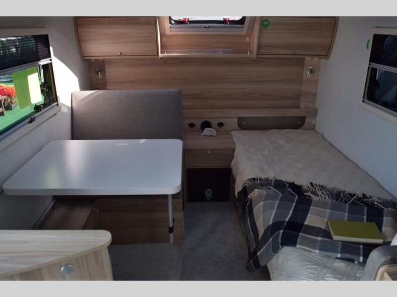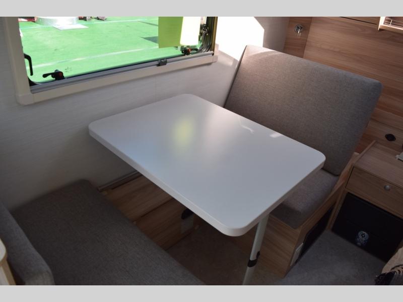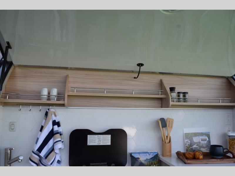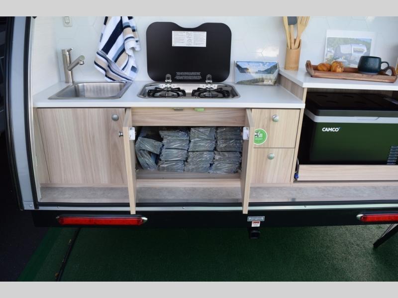 You're going to love camping in this teardrop clamshell trailer! Once you arrive at the campground, you can make lunch on the exterior rear hatch kitchen. There is a two-burner glass-top stove and a 30L 12-volt cooler here to quickly make lunch and grab a cold drink. The interior 5 cu. ft. 12-volt compressor refrigerator will provide more food storage, and an optional microwave can be added inside for the option to heat up quick meals indoors. You're sure to get a great night's rest on the twin-size bed, and the booth dinette can convert to a second twin-size bed so you can sleep two comfortably. The optional Black Canyon Upgrade can be added that includes a solar upgrade to dual 190W panels, holding tank heaters and underglow lights.
