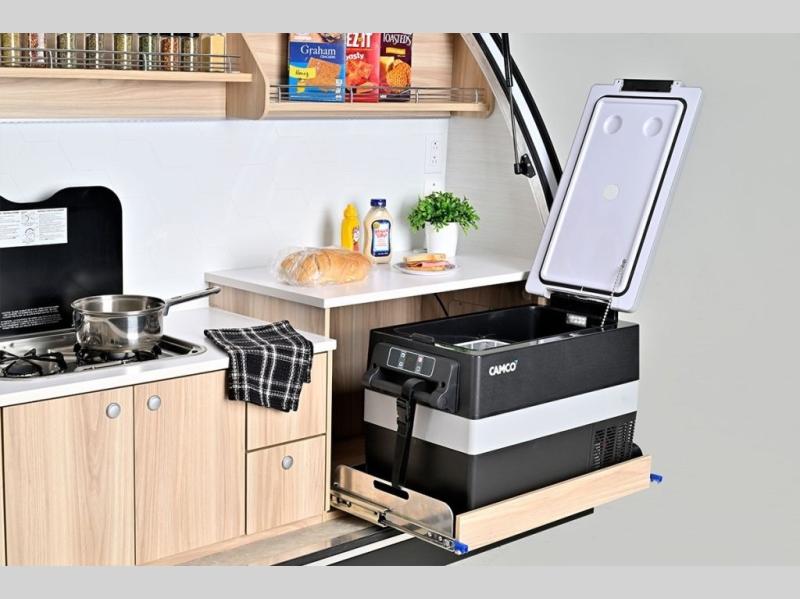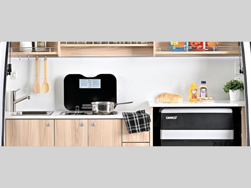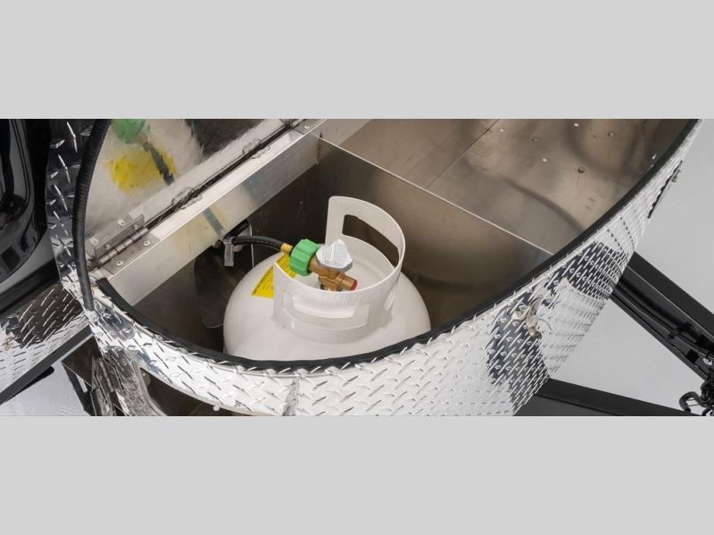 You're going to love camping in this teardrop clamshell trailer! Once you arrive at the campground, you can make lunch on the exterior rear hatch kitchen. There is a two-burner glass-top stove and a 30L 12-volt cooler here to quickly make lunch and grab a cold drink. The interior 5 cu. ft. 12-volt compressor refrigerator will provide more food storage, and an optional microwave can be added inside for the option to heat up quick meals indoors. You're sure to get a great night's rest on the twin-size bed, and the booth dinette can convert to a second twin-size bed so you can sleep two comfortably. The optional Black Canyon Upgrade can be added that includes a solar upgrade to dual 190W panels, holding tank heaters and underglow lights.