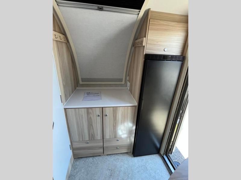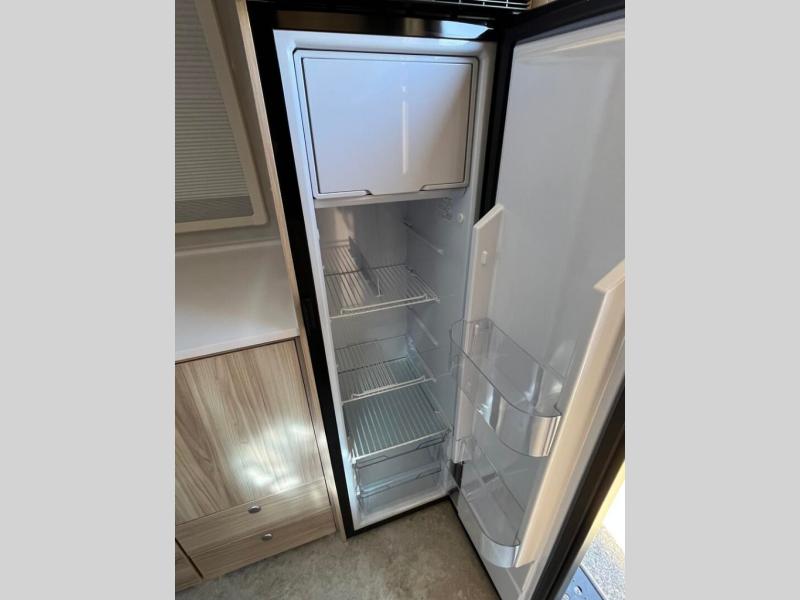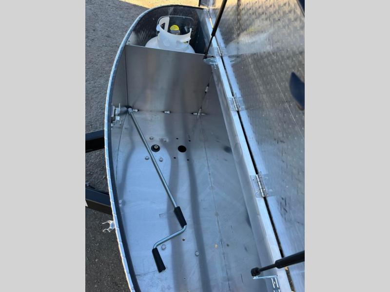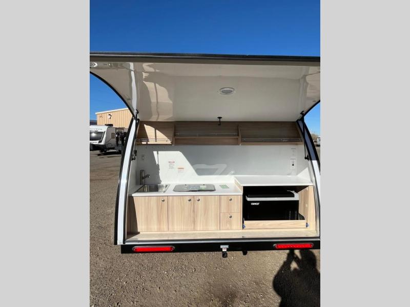 You're going to love camping in this teardrop clamshell trailer! Once you arrive at the campground, you can make lunch on the exterior rear hatch kitchen. There is a two-burner glass-top stove and a 30L 12-volt cooler here to quickly make lunch and grab a cold drink. The interior 5 cu. ft. 12-volt compressor refrigerator will provide more food storage, and an optional microwave can be added inside for the option to heat up quick meals indoors. You're sure to get a great night's rest on the twin-size bed, and the booth dinette can convert to a second twin-size bed so you can sleep two comfortably. When the optional Black Canyon upgrade is chosen on this model, you'll enjoy dual 190-watt solar panels, holding tank heaters, underglow lights, and an XL diamond plate storage tub.