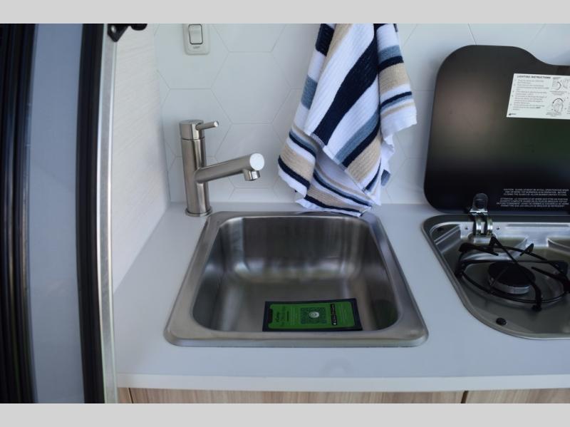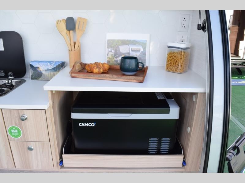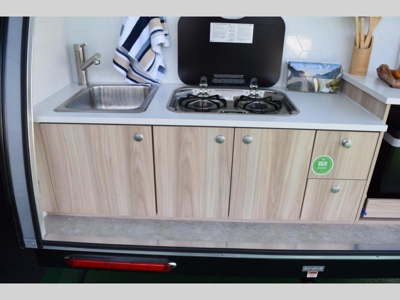 You're going to love camping in this teardrop clamshell trailer! Once you arrive at the campground, you can make lunch on the exterior rear hatch kitchen. There is a two-burner glass-top stove and a 30L 12-volt cooler here to quickly make lunch and grab a cold drink. The interior 5 cu. ft. 12-volt compressor refrigerator will provide more food storage, and an optional microwave can be added inside for the option to heat up quick meals indoors. You're sure to get a great night's rest on the twin-size bed, and the booth dinette can convert to a second twin-size bed so you can sleep two comfortably. The optional Black Canyon Upgrade can be added that includes a solar upgrade to dual 190W panels, holding tank heaters and underglow lights.