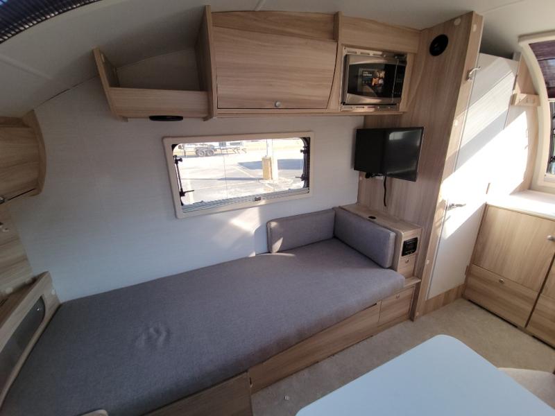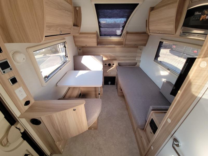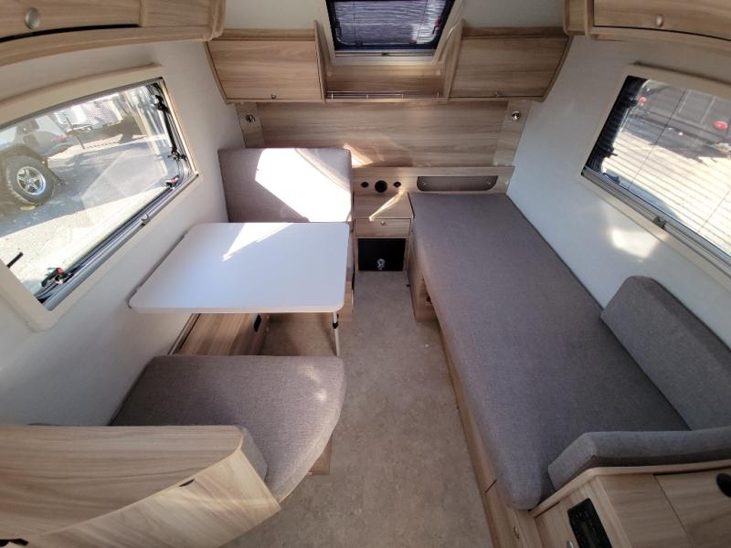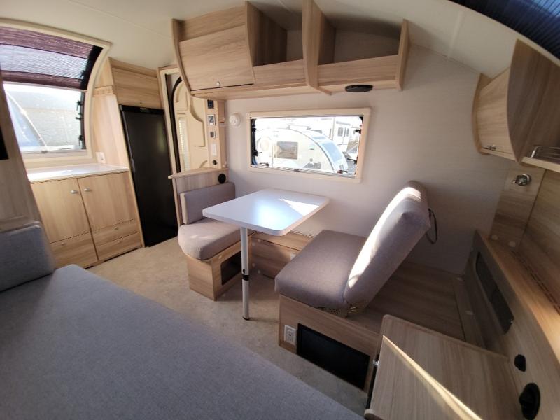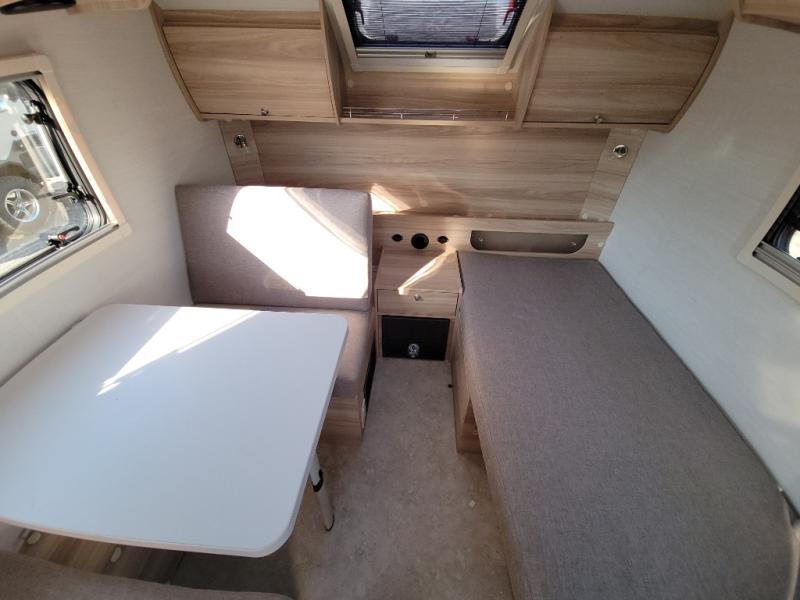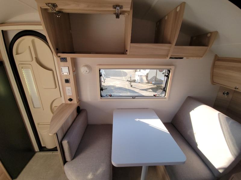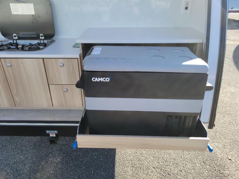 You're going to love camping in this teardrop clamshell trailer! Once you arrive at the campground, you can make lunch on the exterior rear hatch kitchen. There is a two burner glass-top stove and a 45L 12-volt cooler here to quickly make lunch and grab a cold drink. The interior 5 cu. ft. 12-volt compressor refrigerator will provide more food storage, and an optional microwave can be added inside for the option to heat up quick meals indoors. You're sure to get a great night's rest on the twin-size bed, and the booth dinette can convert to a second twin-size bed so you can sleep two comfortably. The optional Black Canyon Upgrade can be added that includes a solar upgrade to dual 190W panels, holding tank heaters and underglow lights. And if you're in the market for a more traditional touring style, the optional Classic Touring Edition may be perfect for you; the Black Canyon Upgrade is not available with this package.