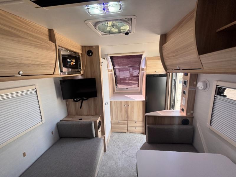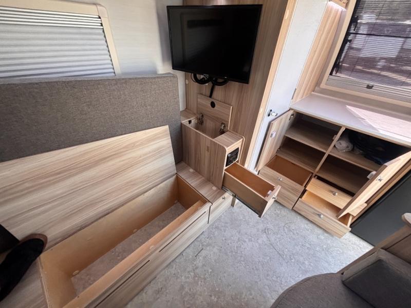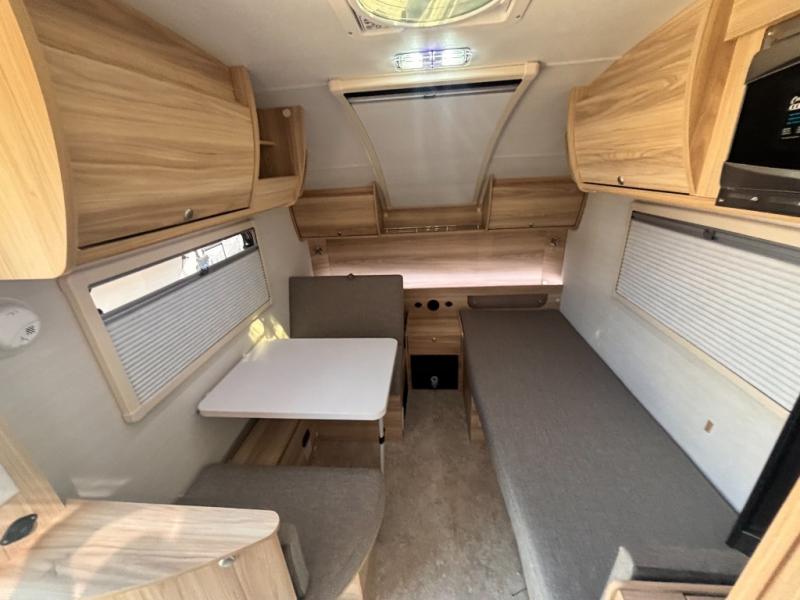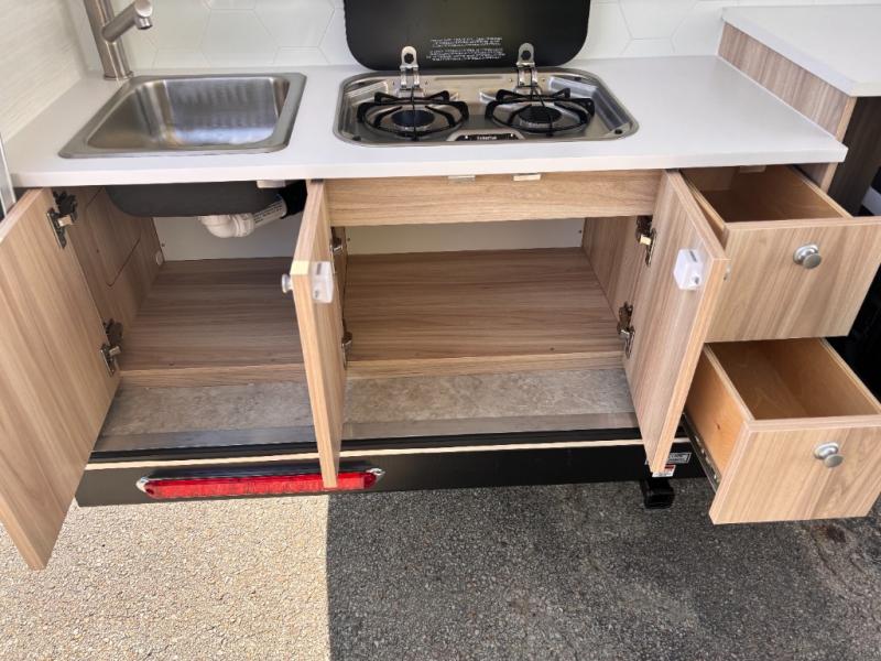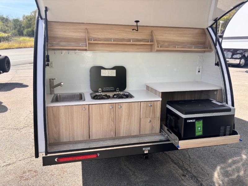 You're going to love camping in this teardrop clamshell trailer! Once you arrive at the campground, you can make lunch on the exterior rear hatch kitchen. There is a two-burner glass-top stove and a 30L 12-volt cooler here to quickly make lunch and grab a cold drink. The interior 5 cu. ft. 12-volt compressor refrigerator will provide more food storage, and an optional microwave can be added inside for the option to heat up quick meals indoors. You're sure to get a great night's rest on the twin-size bed, and the booth dinette can convert to a second twin-size bed so you can sleep two comfortably. The optional Black Canyon Upgrade can be added that includes a solar upgrade to dual 190W panels, holding tank heaters and underglow lights.