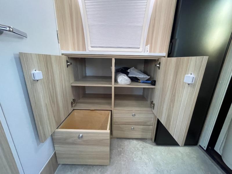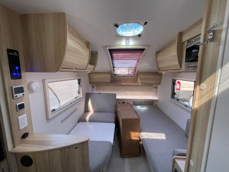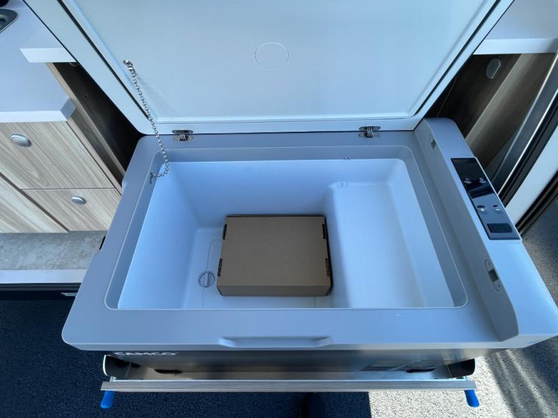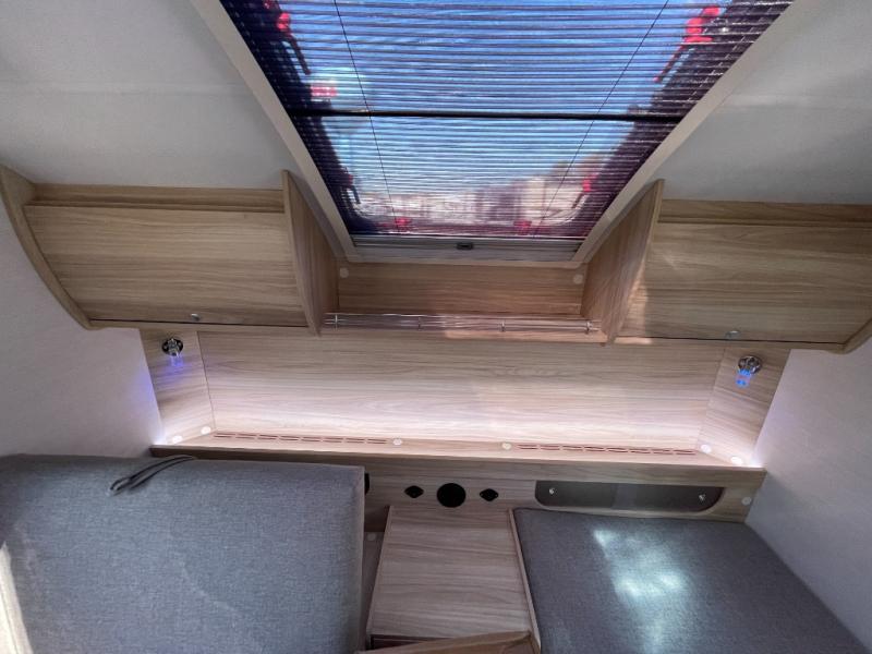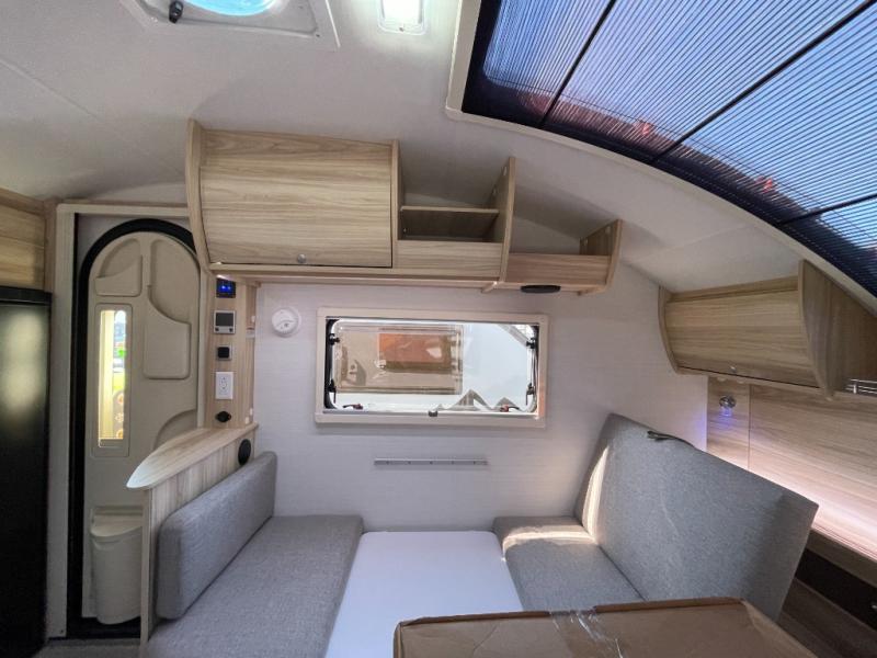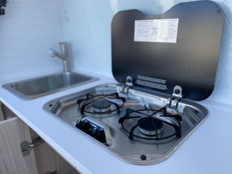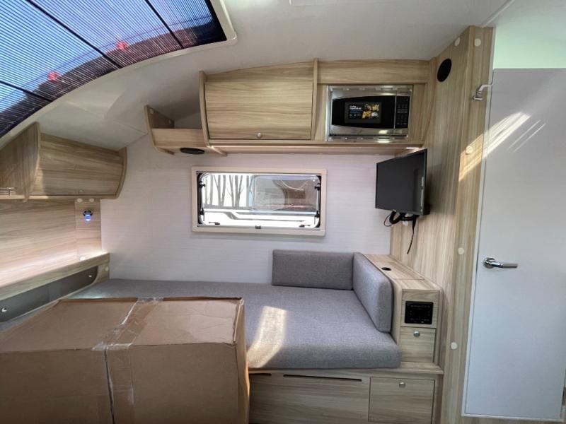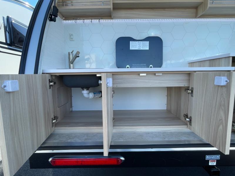 You're going to love camping in this teardrop clamshell trailer! Once you arrive at the campground, you can make lunch on the exterior rear hatch kitchen. There is a two-burner glass-top stove and a 30L 12-volt cooler here to quickly make lunch and grab a cold drink. The interior 5 cu. ft. 12-volt compressor refrigerator will provide more food storage, and an optional microwave can be added inside for the option to heat up quick meals indoors. You're sure to get a great night's rest on the twin-size bed, and the booth dinette can convert to a second twin-size bed so you can sleep two comfortably. The optional Black Canyon Upgrade can be added that includes a solar upgrade to dual 190W panels, holding tank heaters and underglow lights.