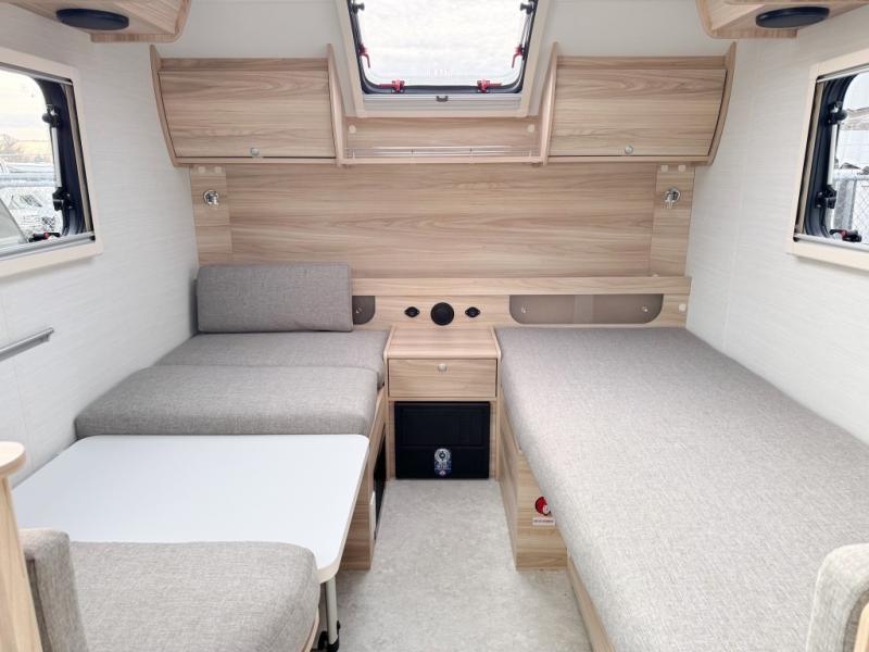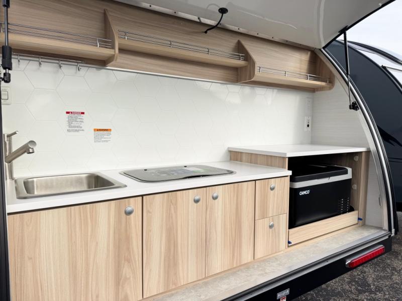 You're going to love camping in this teardrop clamshell trailer! Once you arrive at the campground, you can make lunch on the exterior rear hatch kitchen. There is a two-burner glass-top stove and a 30L 12-volt cooler here to quickly make lunch and grab a cold drink. The interior 5 cu. ft. 12-volt compressor refrigerator will provide more food storage, and an optional microwave can be added inside for the option to heat up quick meals indoors. You're sure to get a great night's rest on the twin-size bed, and the booth dinette can convert to a second twin-size bed so you can sleep two comfortably. The optional Black Canyon Upgrade can be added that includes a solar upgrade to dual 190W panels, holding tank heaters and underglow lights.