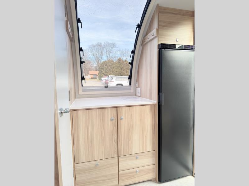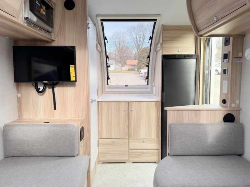 The TAB 360 CS teardrop trailer by nuCamp RV lets you take comfort with you wherever you roam! Since the kitchen has been moved outdoors with a hatch door, you'll enjoy a more spacious interior, while still experiencing an easy tow. Outside, there are aggressive off-road tires, a Nautilus water system with an external shower, plus a diamond plate storage tub. You'll love the look of the premium soft-close cabinetry, and the composite flooring will be easy to keep clean. There is also an Alde heating/hot water system, dual stargazer windows, and a power roof fan to name a few more conveniences. The Convenience Package includes a 190-watt solar panel and an external solar port, plus a 100Ah 12V lithium battery, an intelligent battery detection converter and a Bluetooth Smartshunt battery monitor. The optional Battle Born Lithium Battery Upgrade can be added that includes a 270Ah 12V lithium battery bank with internal heat and a 3,000-watt MultiPlus inverter/charger for even more power options!
