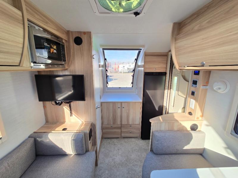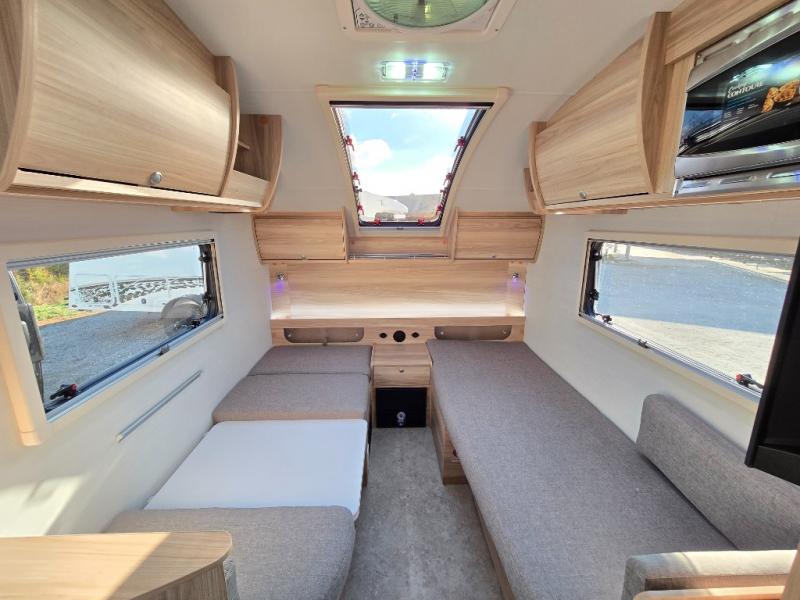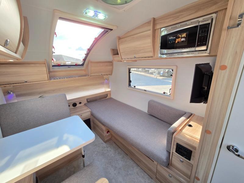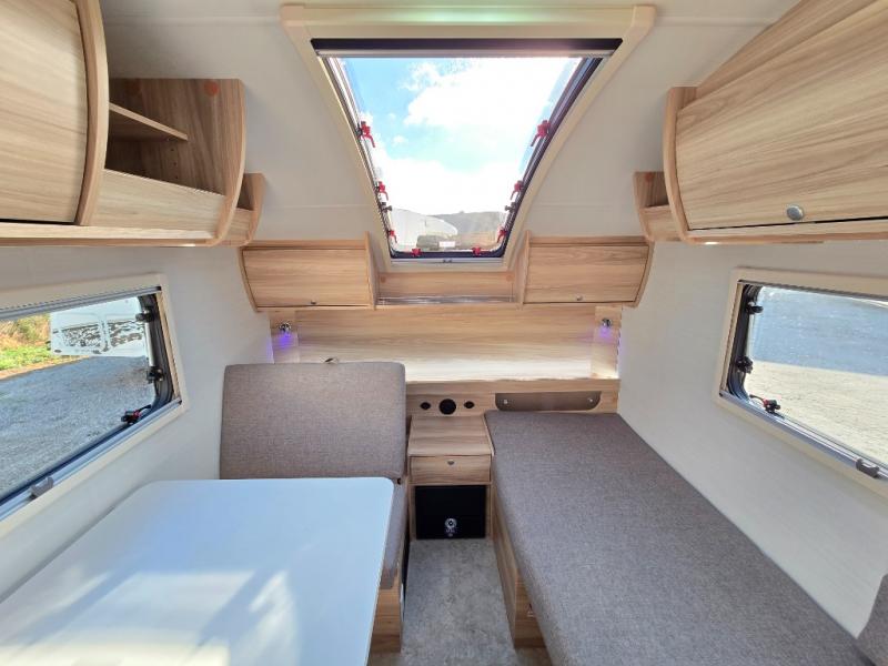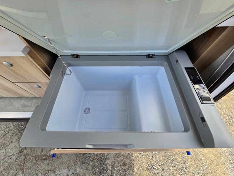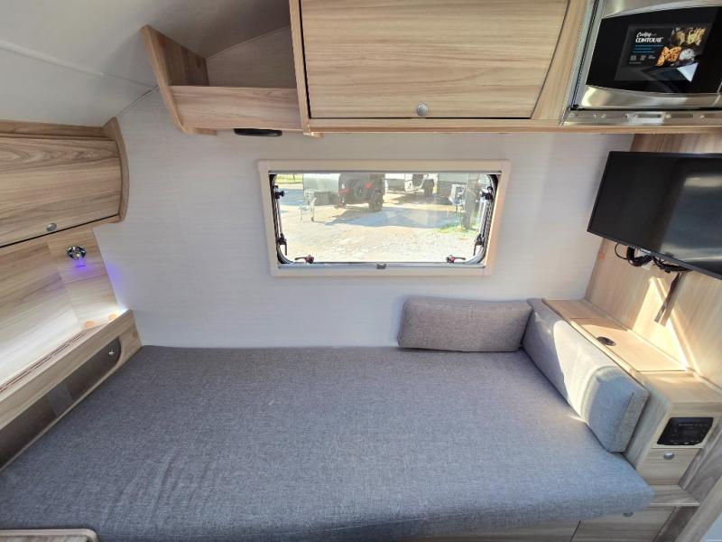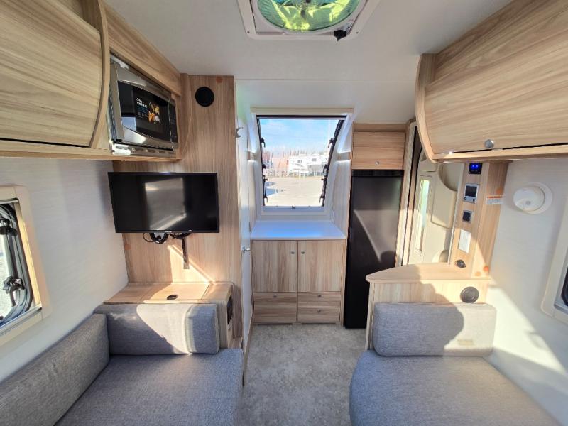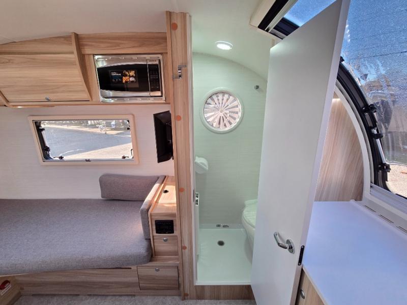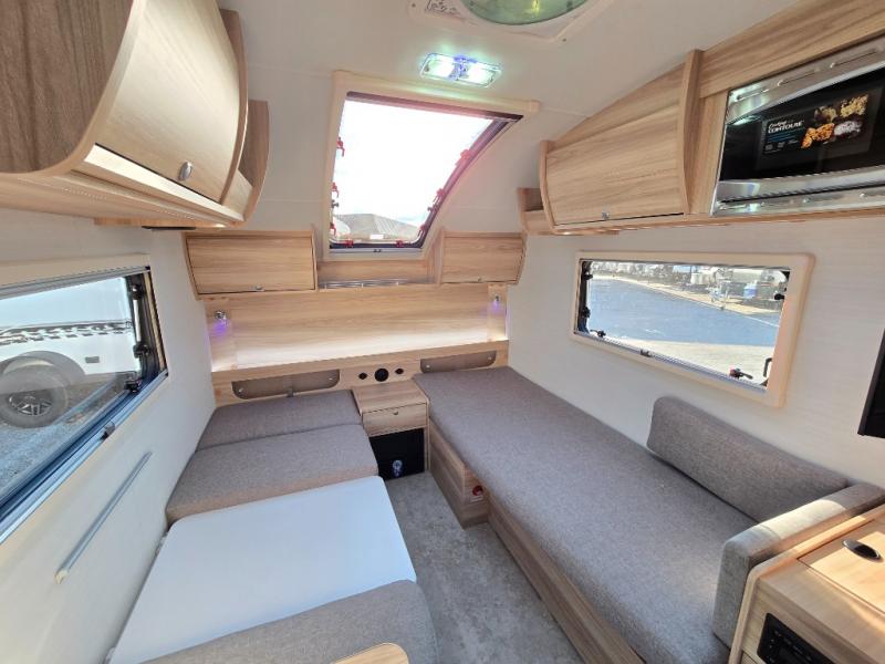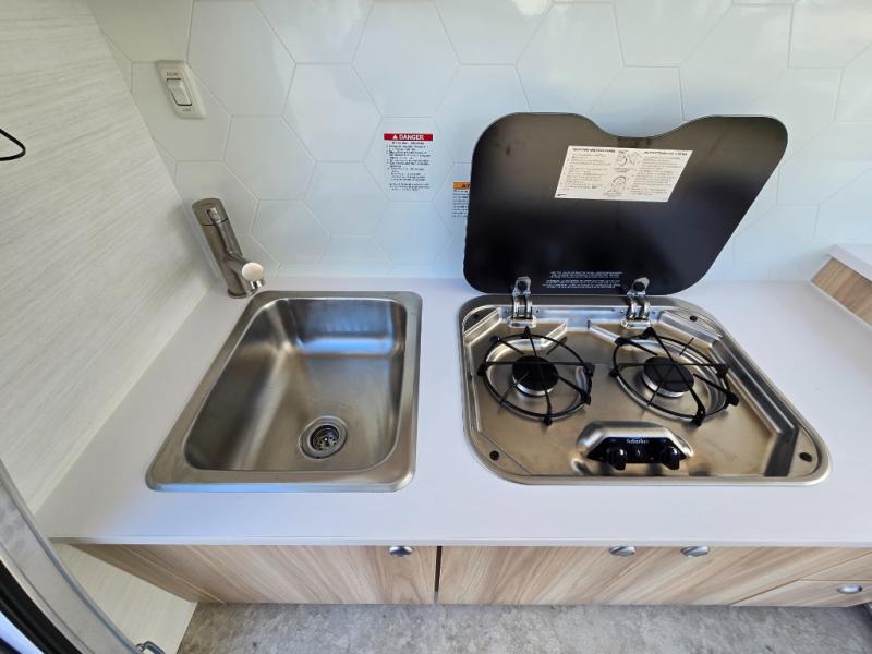 You're going to love camping in this teardrop clamshell trailer! Once you arrive at the campground, you can make lunch on the exterior rear hatch kitchen. There is a two-burner glass-top stove and a 30L 12-volt cooler here to quickly make lunch and grab a cold drink. The interior 5 cu. ft. 12-volt compressor refrigerator will provide more food storage, and an optional microwave can be added inside for the option to heat up quick meals indoors. You're sure to get a great night's rest on the twin-size bed, and the booth dinette can convert to a second twin-size bed so you can sleep two comfortably. The optional Black Canyon Upgrade can be added that includes a solar upgrade to dual 190W panels, holding tank heaters and underglow lights.