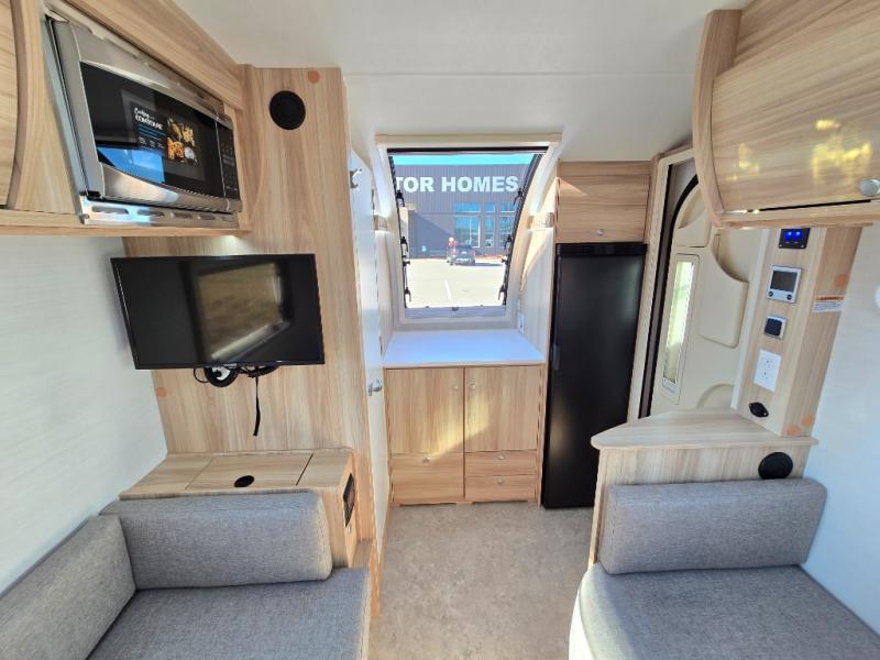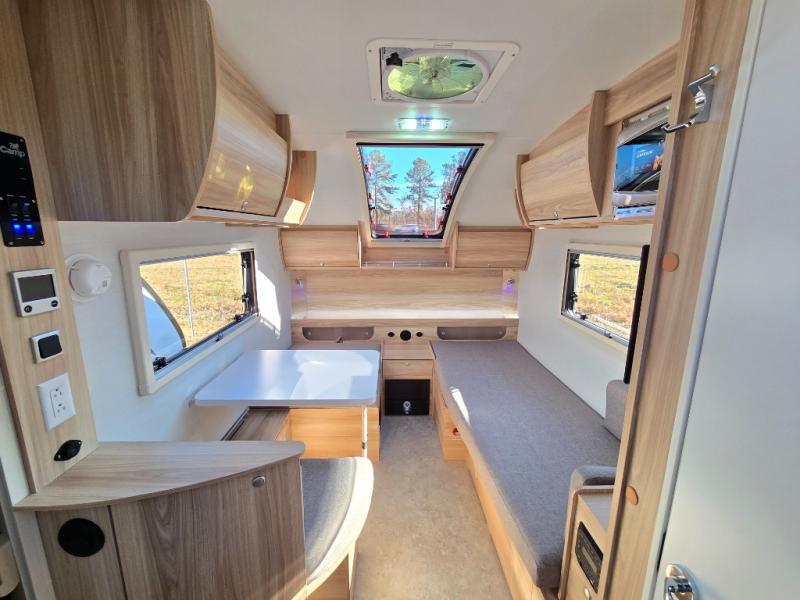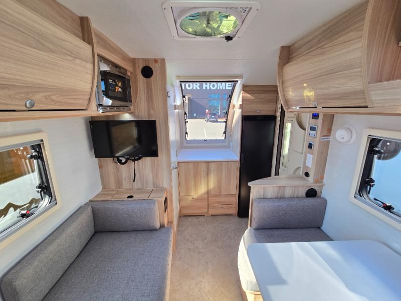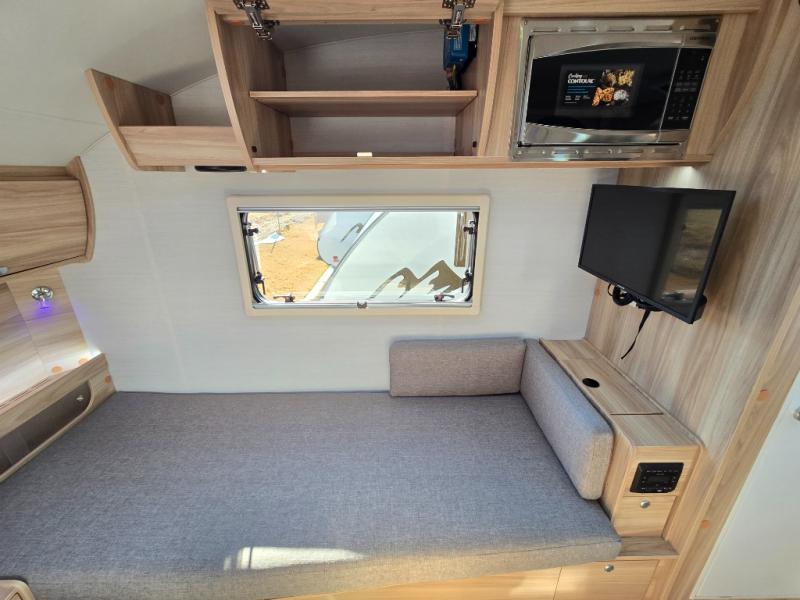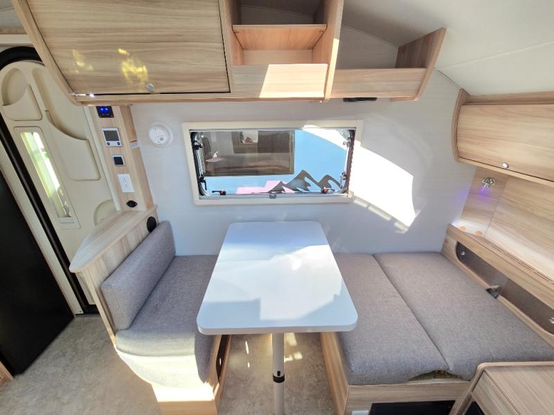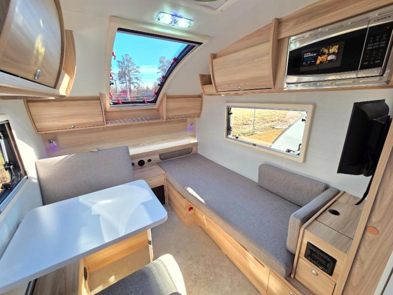 You're going to love camping in this teardrop clamshell trailer! Once you arrive at the campground, you can make lunch on the exterior rear hatch kitchen. There is a two-burner glass-top stove and a 30L 12-volt cooler here to quickly make lunch and grab a cold drink. The interior 5 cu. ft. 12-volt compressor refrigerator will provide more food storage, and an optional microwave can be added inside for the option to heat up quick meals indoors. You're sure to get a great night's rest on the twin-size bed, and the booth dinette can convert to a second twin-size bed so you can sleep two comfortably. The optional Black Canyon Upgrade can be added that includes a solar upgrade to dual 190W panels, holding tank heaters and underglow lights.