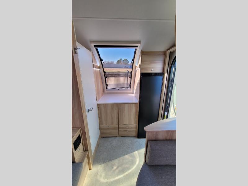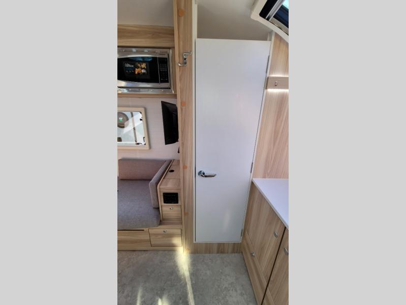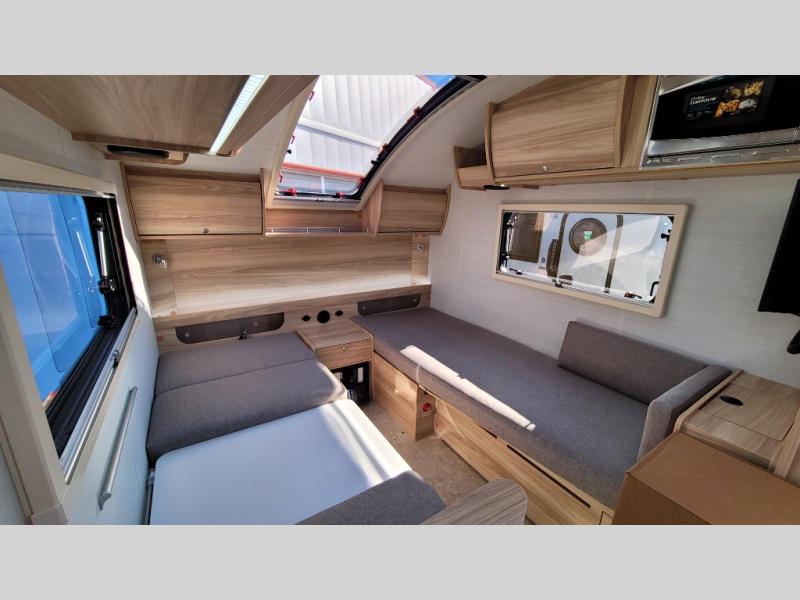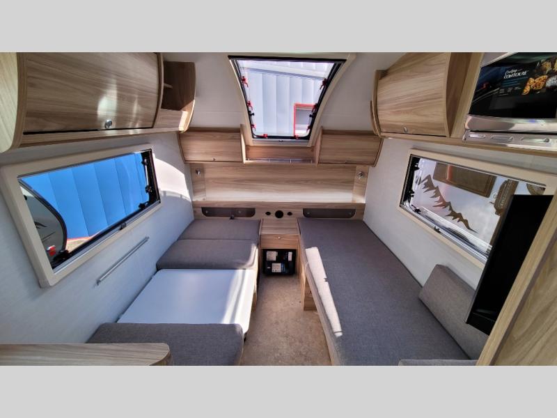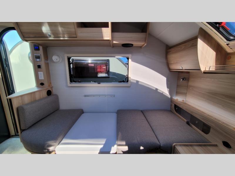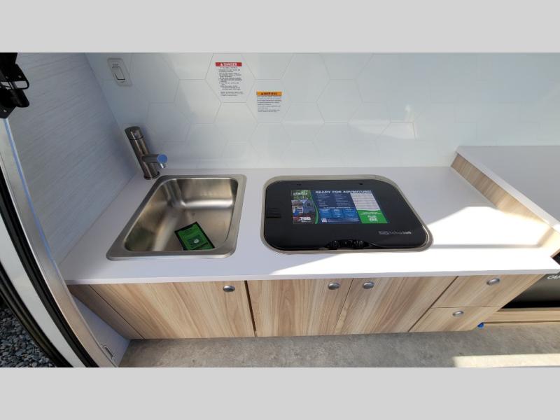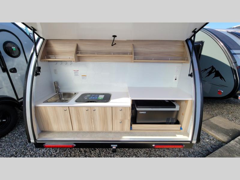 You're going to love camping in this teardrop clamshell trailer! Once you arrive at the campground, you can make lunch on the exterior rear hatch kitchen. There is a two-burner glass-top stove and a 30L 12-volt cooler here to quickly make lunch and grab a cold drink. The interior 5 cu. ft. 12-volt compressor refrigerator will provide more food storage, and an optional microwave can be added inside for the option to heat up quick meals indoors. You're sure to get a great night's rest on the twin-size bed, and the booth dinette can convert to a second twin-size bed so you can sleep two comfortably. The optional Black Canyon Upgrade can be added that includes a solar upgrade to dual 190W panels, holding tank heaters and underglow lights.