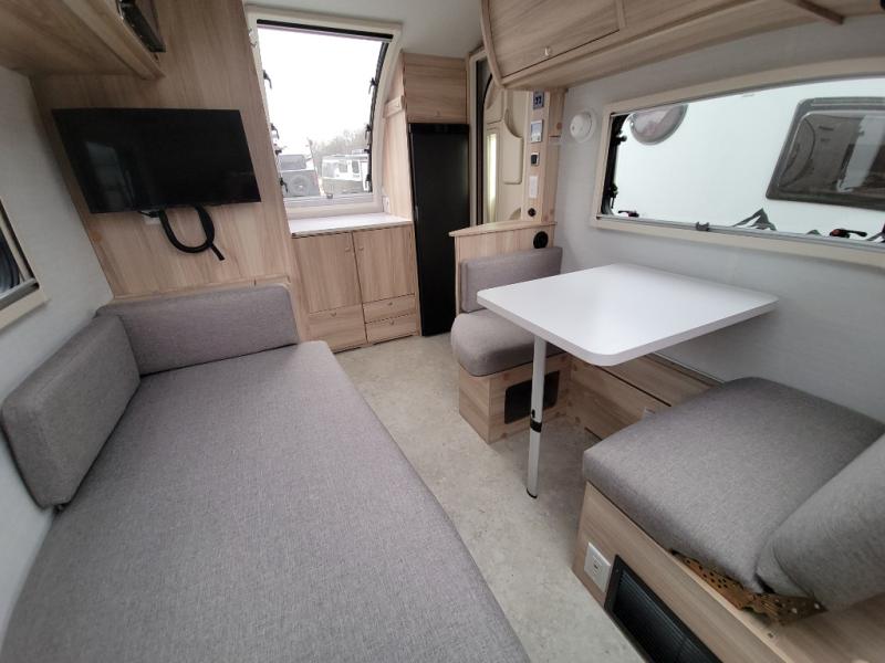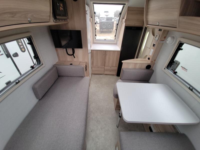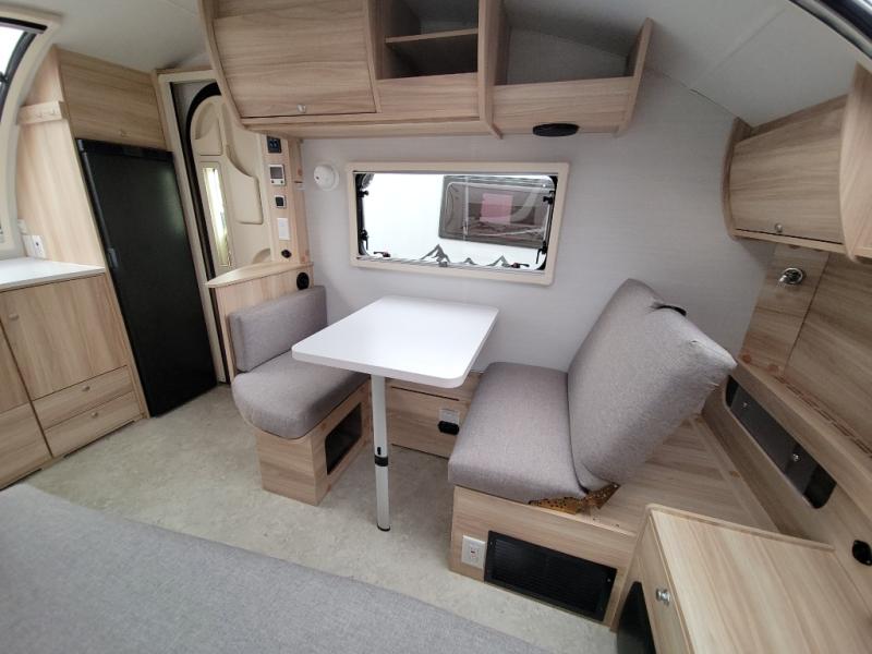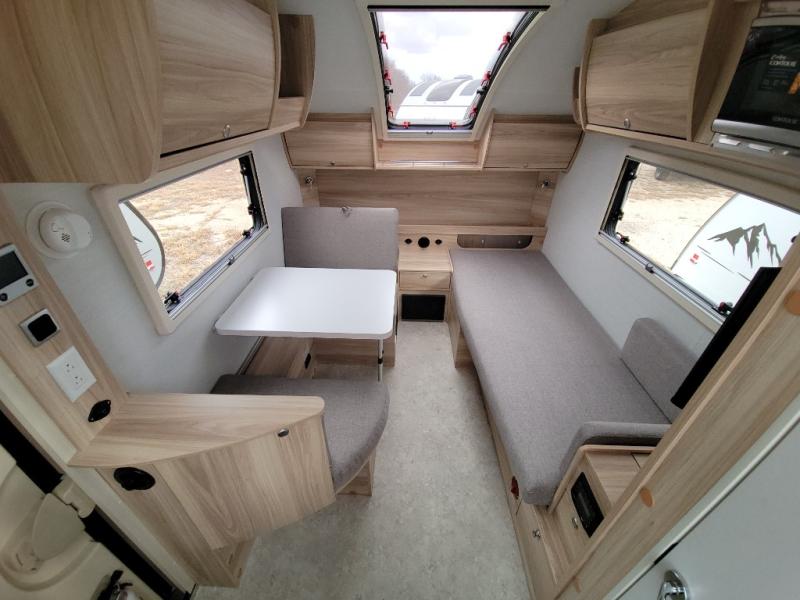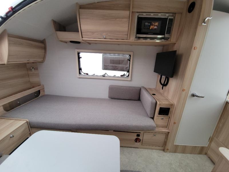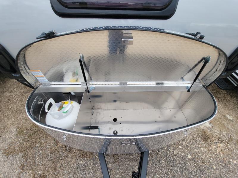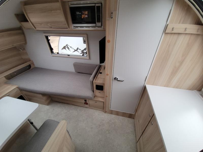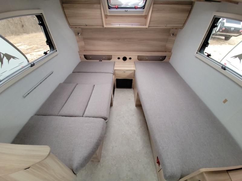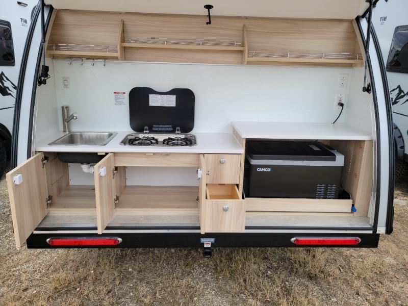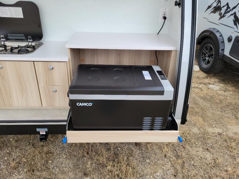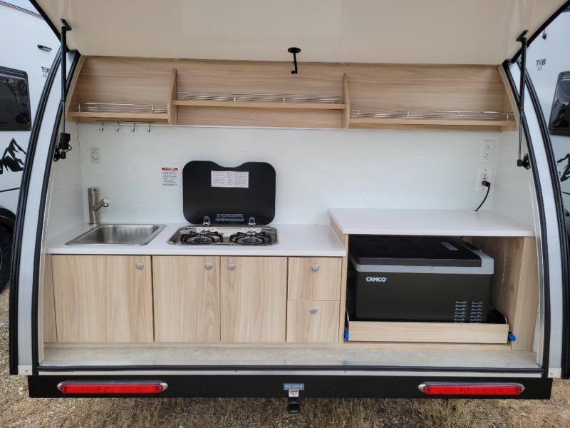 You're going to love camping in this teardrop clamshell trailer! Once you arrive at the campground, you can make lunch on the exterior rear hatch kitchen. There is a two-burner glass-top stove and a 30L 12-volt cooler here to quickly make lunch and grab a cold drink. The interior 5 cu. ft. 12-volt compressor refrigerator will provide more food storage, and an optional microwave can be added inside for the option to heat up quick meals indoors. You're sure to get a great night's rest on the twin-size bed, and the booth dinette can convert to a second twin-size bed so you can sleep two comfortably. The optional Black Canyon Upgrade can be added that includes a solar upgrade to dual 190W panels, holding tank heaters and underglow lights.