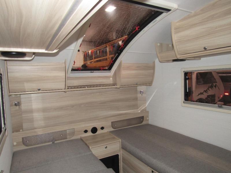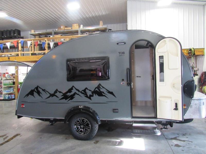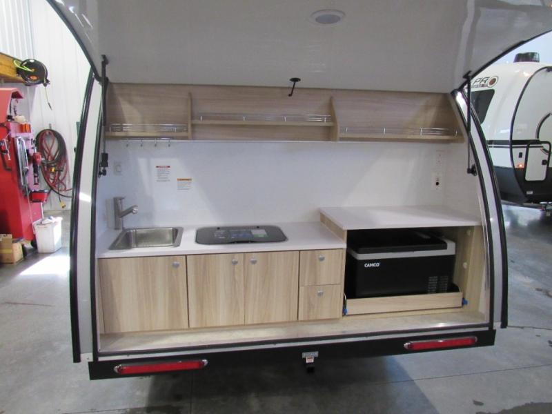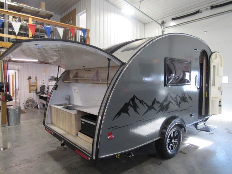 Additional Options: Black Canyon Package ( 2 190W Solar Panels, Holding Tank Heaters, Under-Glow Lights), Upgraded Charcoal Sidewall, Elevation Graphic, Microwave Add-on, Maxxfan UpgradenuCamp RV TAB 360 CS teardrop trailer Boondock highlights: