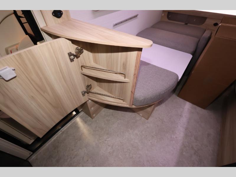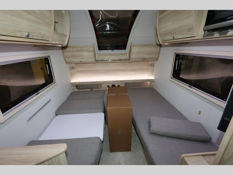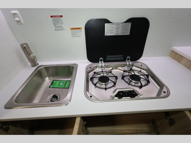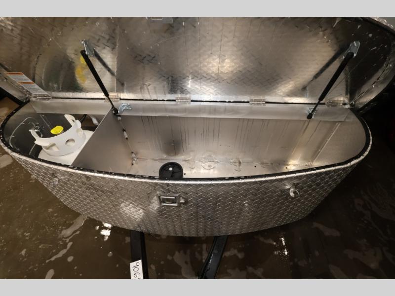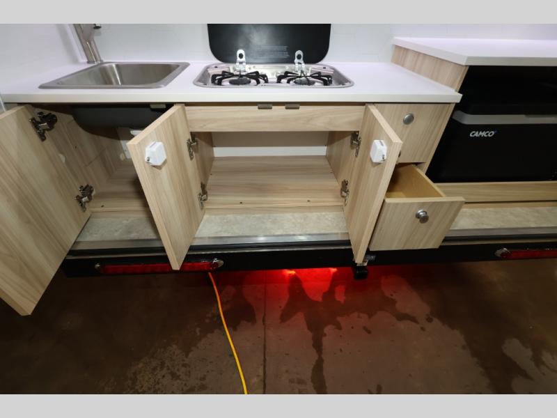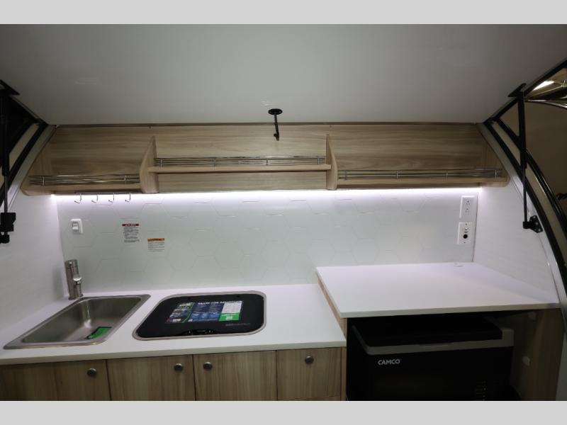 You're going to love camping in this teardrop clamshell trailer! Once you arrive at the campground, you can make lunch on the exterior rear hatch kitchen. There is a two-burner glass-top stove and a 30L 12-volt cooler here to quickly make lunch and grab a cold drink. The interior 5 cu. ft. 12-volt compressor refrigerator will provide more food storage, and an optional microwave can be added inside for the option to heat up quick meals indoors. You're sure to get a great night's rest on the twin-size bed, and the booth dinette can convert to a second twin-size bed so you can sleep two comfortably. The optional Black Canyon Upgrade can be added that includes a solar upgrade to dual 190W panels, holding tank heaters and underglow lights.