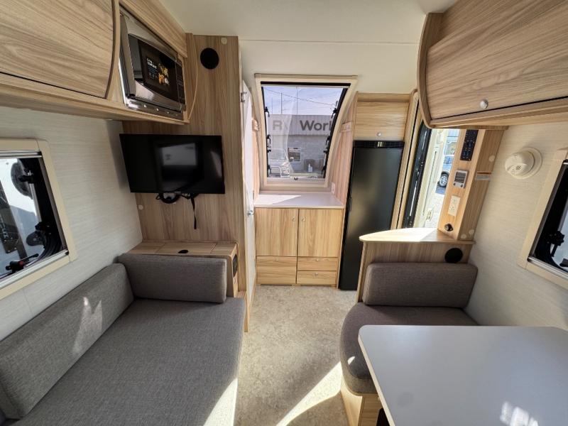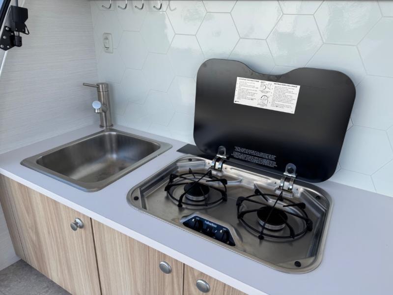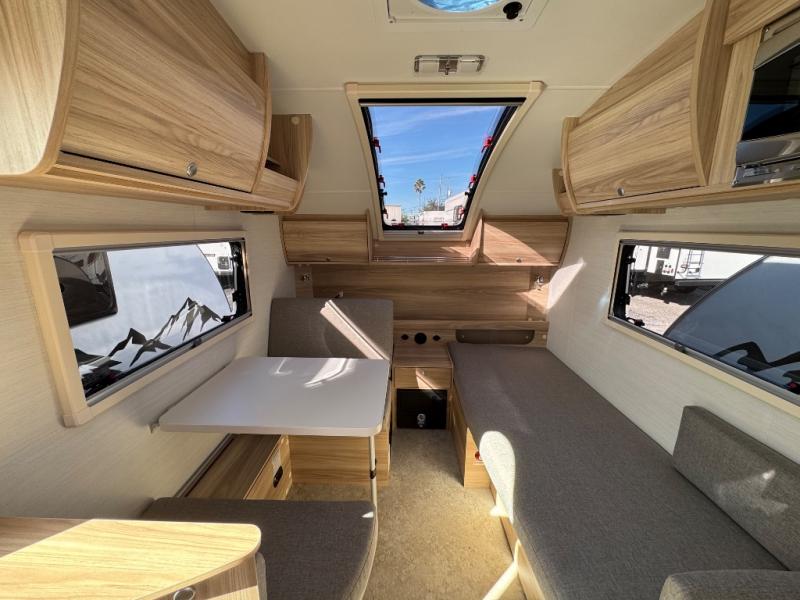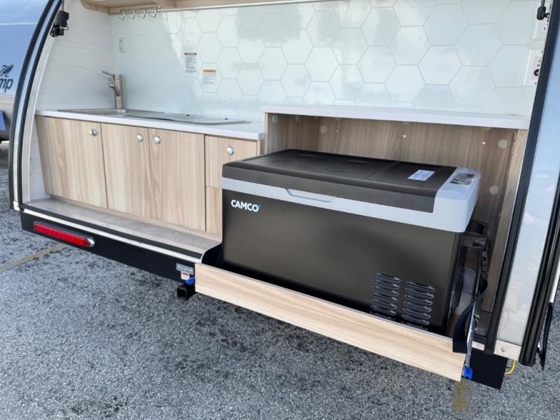 You're going to love camping in this teardrop clamshell trailer! Once you arrive at the campground, you can make lunch on the exterior rear hatch kitchen. There is a two-burner glass-top stove and a 30L 12-volt cooler here to quickly make lunch and grab a cold drink. The interior 5 cu. ft. 12-volt compressor refrigerator will provide more food storage, and an optional microwave can be added inside for the option to heat up quick meals indoors. You're sure to get a great night's rest on the twin-size bed, and the booth dinette can convert to a second twin-size bed so you can sleep two comfortably. The optional Black Canyon Upgrade can be added that includes a solar upgrade to dual 190W panels, holding tank heaters and underglow lights.