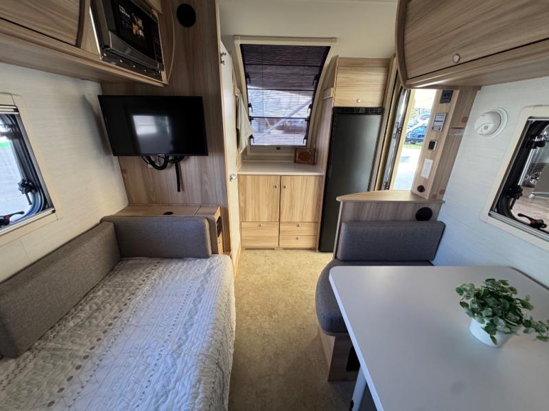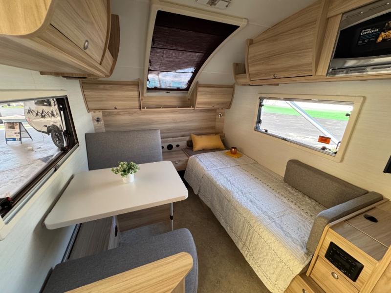 You're going to love camping in this teardrop clamshell trailer! Once you arrive at the campground, you can make lunch on the exterior rear hatch kitchen. There is a two-burner glass-top stove and a 30L 12-volt cooler here to quickly make lunch and grab a cold drink. The interior 5 cu. ft. 12-volt compressor refrigerator will provide more food storage, and an optional microwave can be added inside for the option to heat up quick meals indoors. You're sure to get a great night's rest on the twin-size bed, and the booth dinette can convert to a second twin-size bed so you can sleep two comfortably. The optional Black Canyon Upgrade can be added that includes a solar upgrade to dual 190W panels, holding tank heaters and underglow lights.