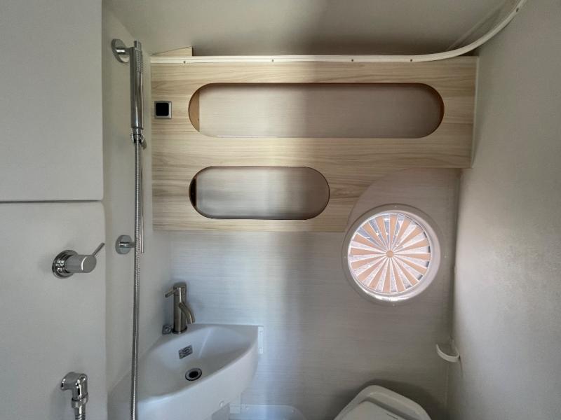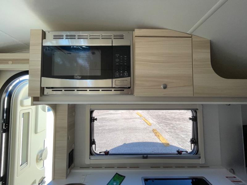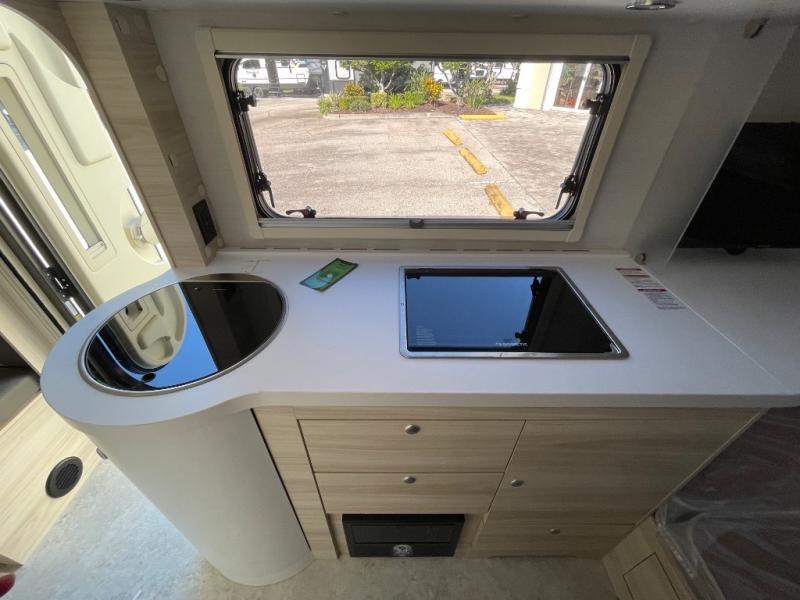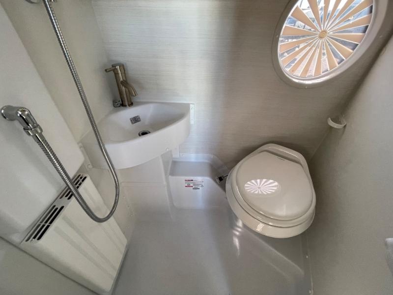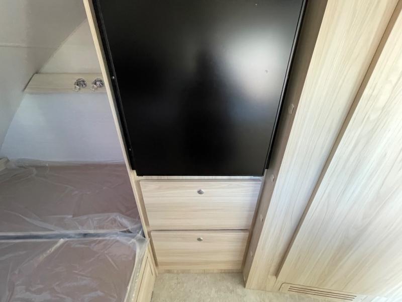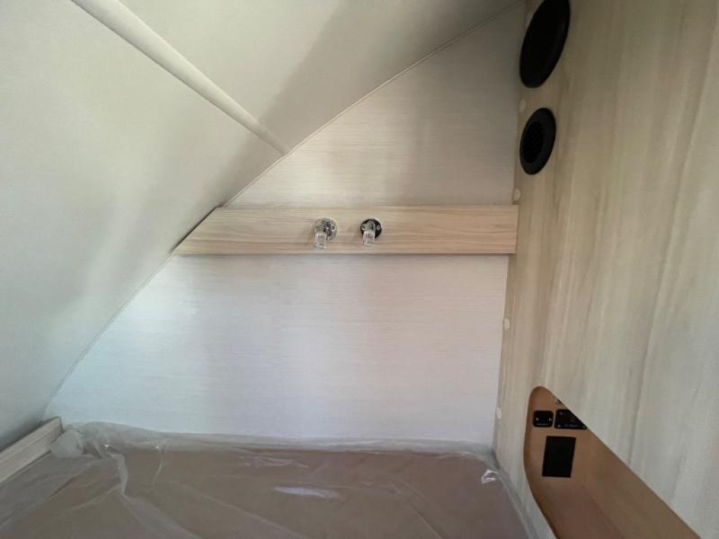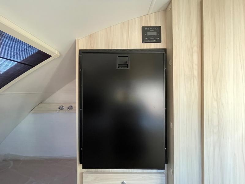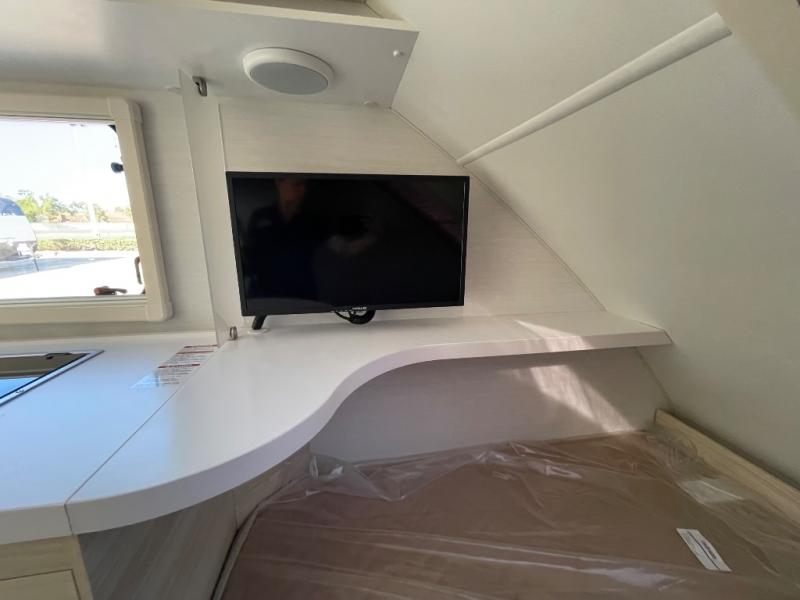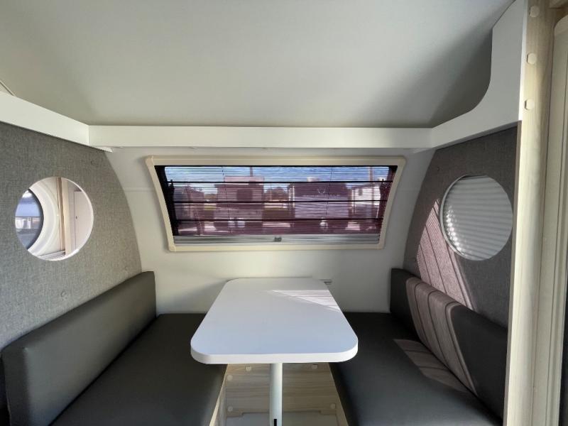 This teardrop trailer offers sleeping space for three with two sleeping areas; one up front and one in the rear. The dinette allows you to eat and relax during the day, and at night this space becomes sleeping space for one. And if you're needing even more sleeping space, you can choose the optional bunk floorplan! The queen-size sleeping area is located on the opposite side with the wet bath in between for convenience for all. The galley kitchen will give the cook a place to make warm meals and store leftovers in the 4.6 cu. ft. 12V compressor refrigerator. Everyone can watch the 24" TV through the Bluetooth media center before bedtime, or in the morning as you all plan your next activity. And the Alde central heating/hot water system, as well as central air conditioning will keep you comfortable wherever you set up. An optional Black Canyon Upgrade is available with an additional 310-watt solar panel, holding tank heaters, underglow lights, and an XL diamond plate storage tub.