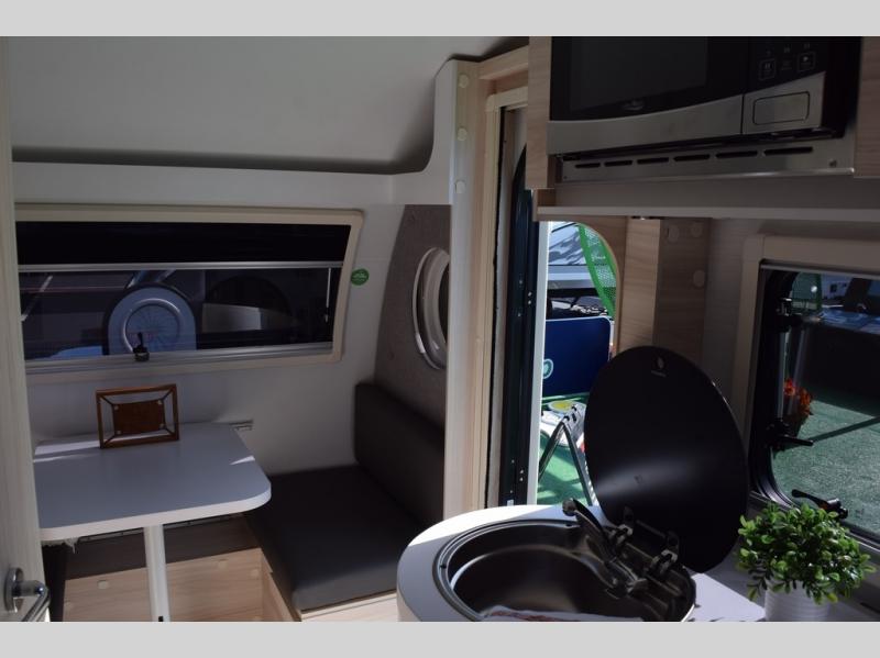 The TAB 400 by nuCamp RV is mighty in essentials and spacious for a teardrop trailer! There is a Froli sleep system, a spacious wet bath, a galley kitchen and plenty of storage plus a dinette. Inside you will enjoy the Bluetooth media center, premium soft-close cabinetry, and an expansive picture window. You'll also find composite flooring, a rail table, and a power roof fan to name a few more comforts. The Convenience Package comes with a 310-watt solar panel, a 1,200-watt power inverter, a 100AH 12-volt lithium battery, and more features to help you camp off grid! Along with the optional Black Canyon Upgrade, you can also choose the optional Lithium Battery Upgrade, an optional microwave, and an optional Maxxair fan to further customize your camper!